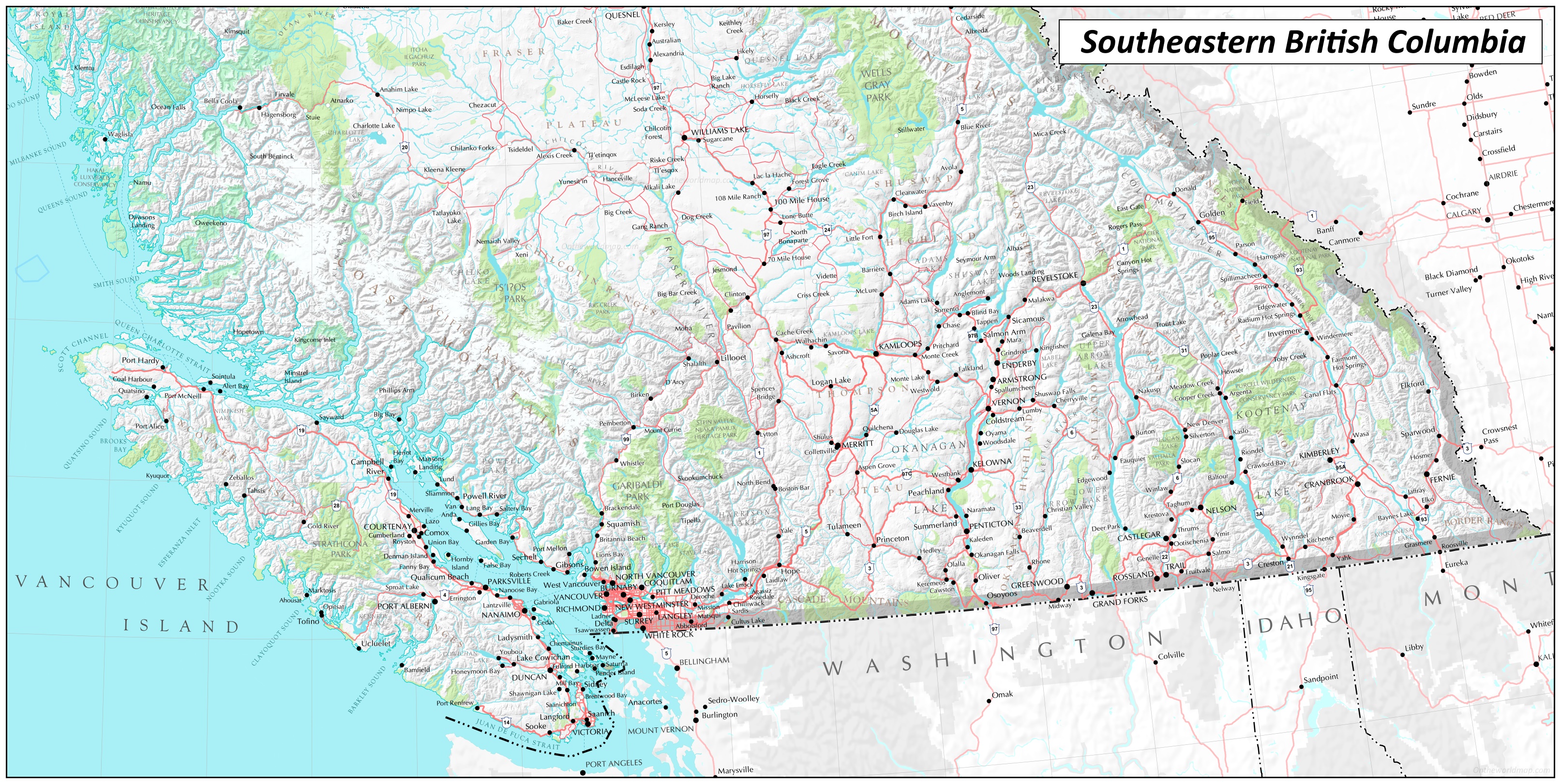 This map shows cities, towns, villages, islands, rivers, lakes, highways, major roads, secondary roads, mountains ranges, and national parks in Southern British Columbia.