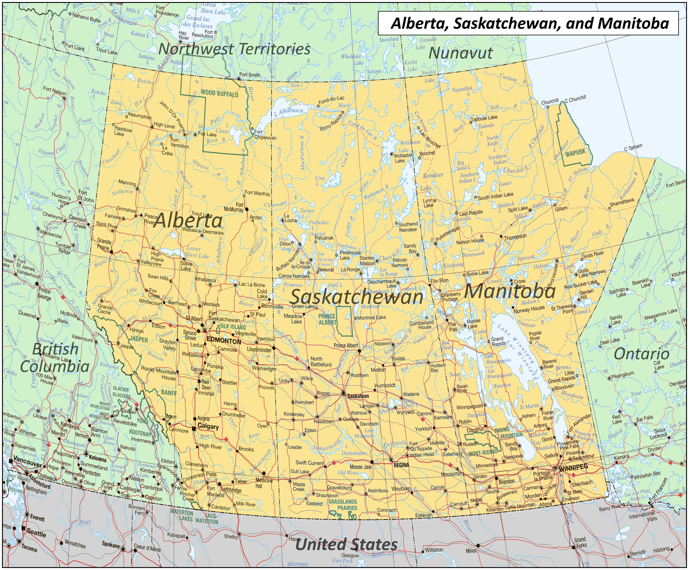 This map shows cities, towns, rivers, lakes, parks, highways, Trans-Canada highway, and main roads in Alberta, Saskatchewan, and Manitoba (Canadian Prairies).