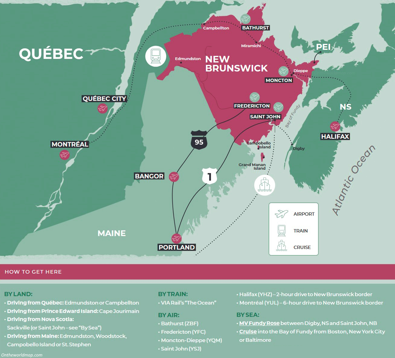 This map shows How to get to New Brunswick by plane, car, train, ferry, and cruise ship.