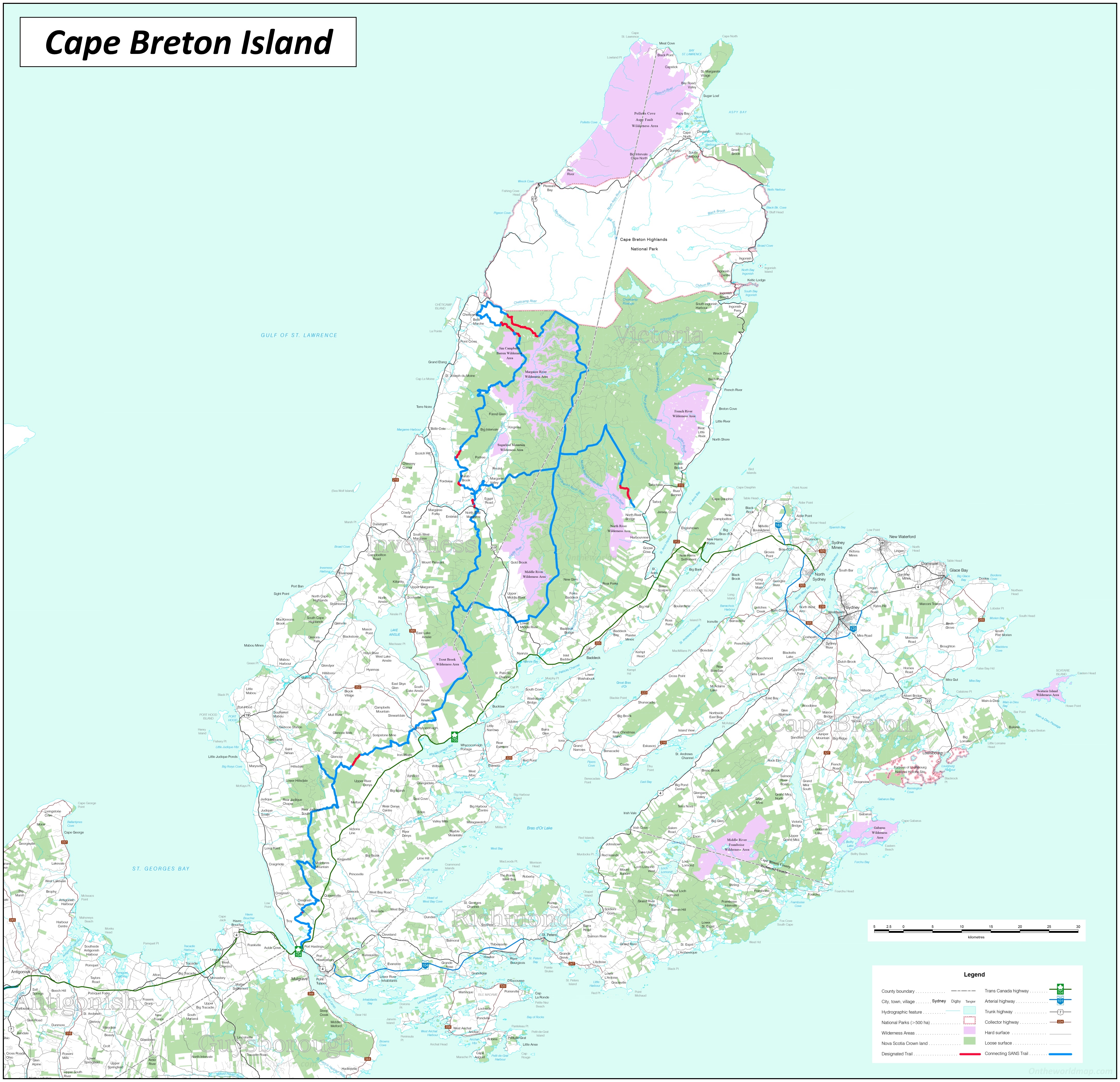 This map shows cities, towns, villages, county boundaries, rivers, lakes, Trans-Canada highway, roads, national parks, and trails on Cape Breton Island.