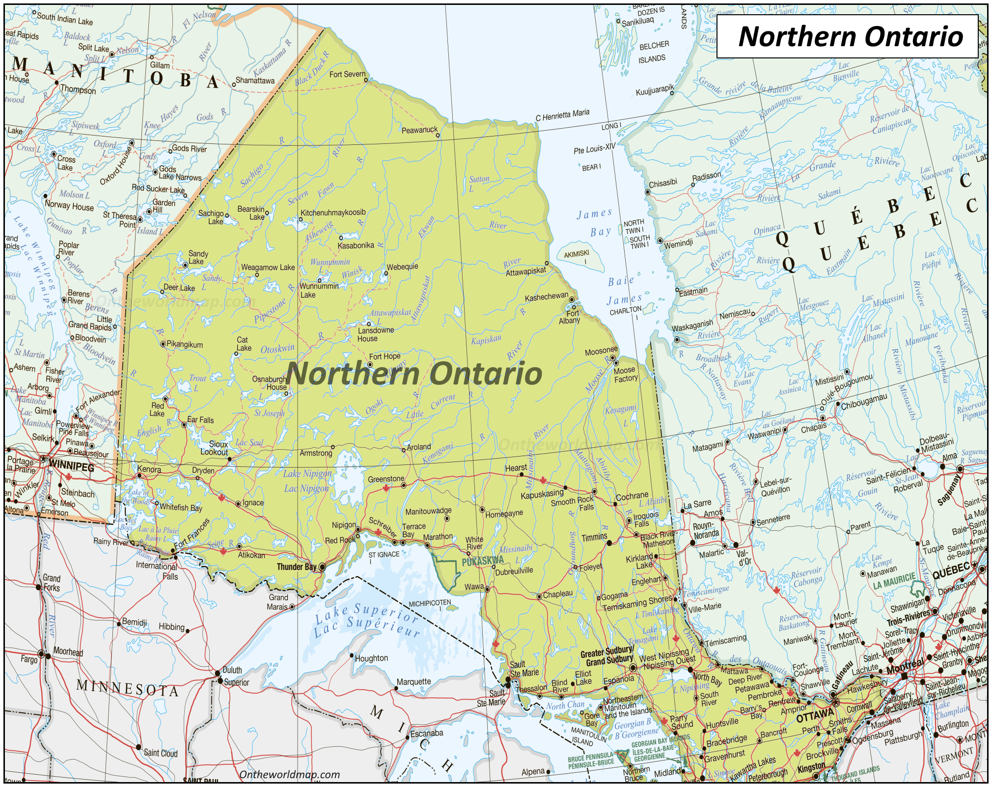 This map shows cities, towns, rivers, lakes, national parks, major roads, minor roads, railways, and Trans-Canada highway in Northern Ontario.