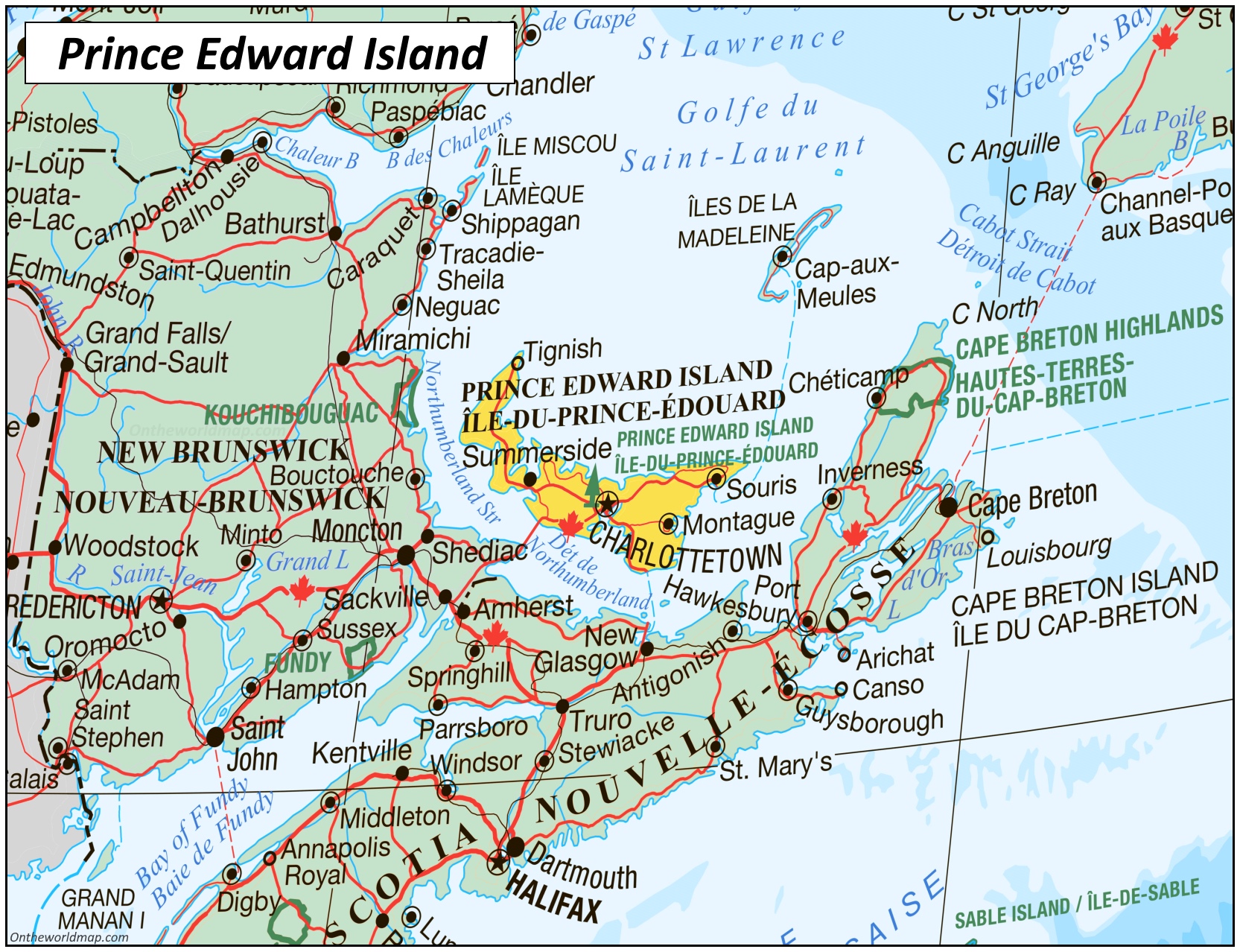 This map shows cities, towns, islands, Trans-Canada highway, major highways, secondary roads, railways, and national parks in Prince Edward Island Area.