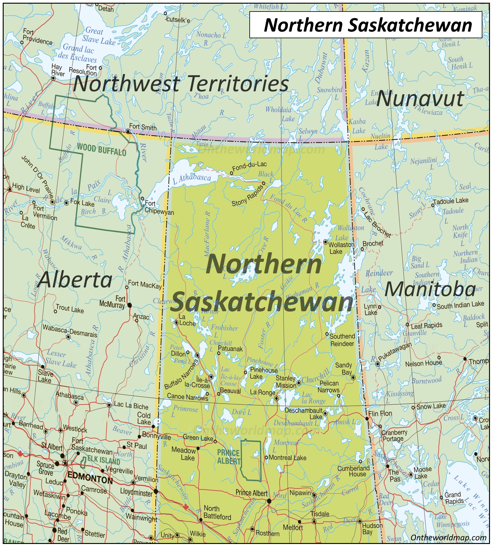 This map shows cities, towns, rivers, lakes, highways, major roads, and national parks in Northern Saskatchewan.