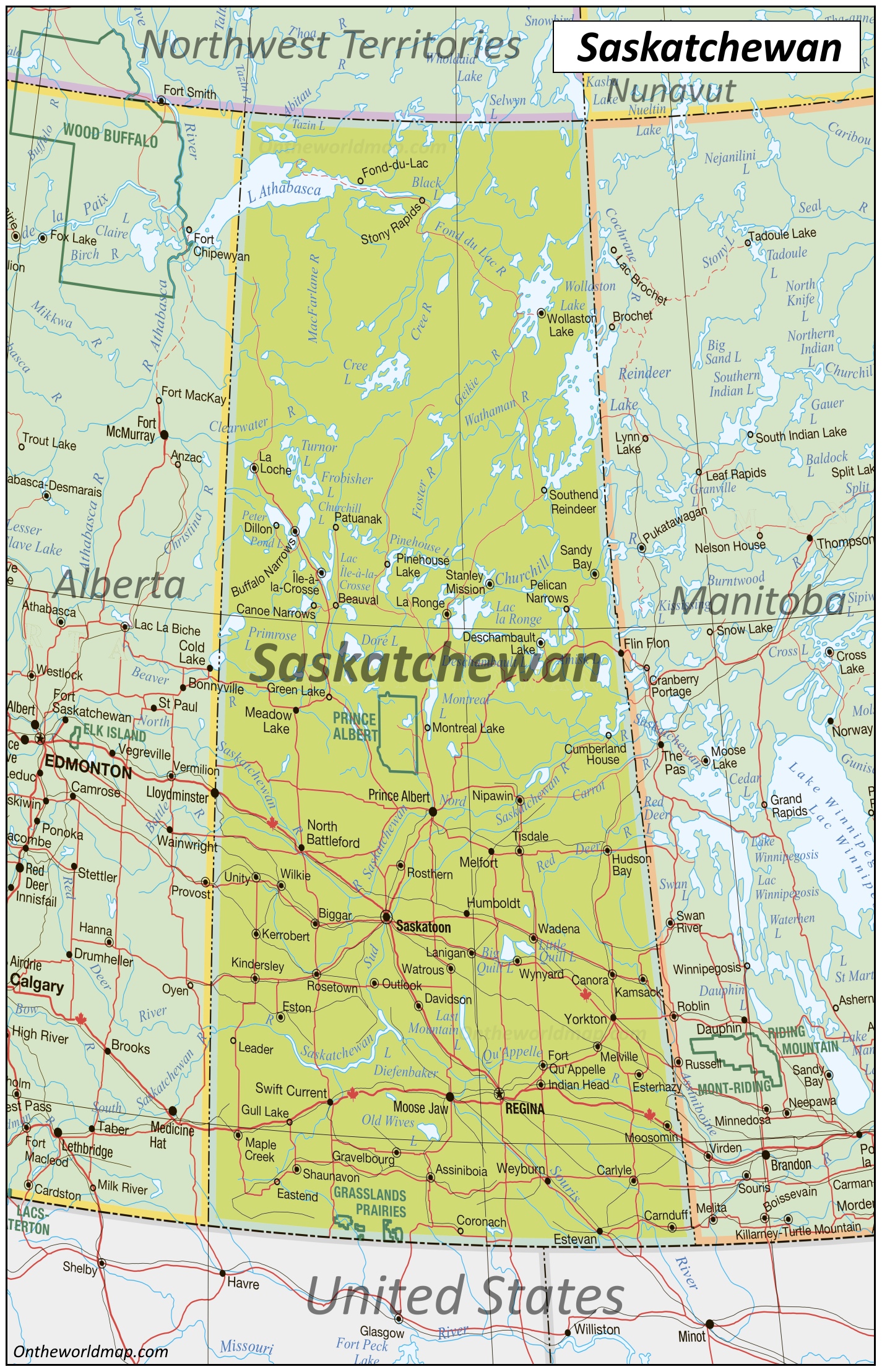 Maps of Saskatchewan: Large detailed tourist map of Saskatchewan with cities and towns | Saskatchewan Highway Map | Saskatchewan rail map | Map of Northern Saskatchewan | Map of Southern Saskatchewan | Saskatchewan Bus Map