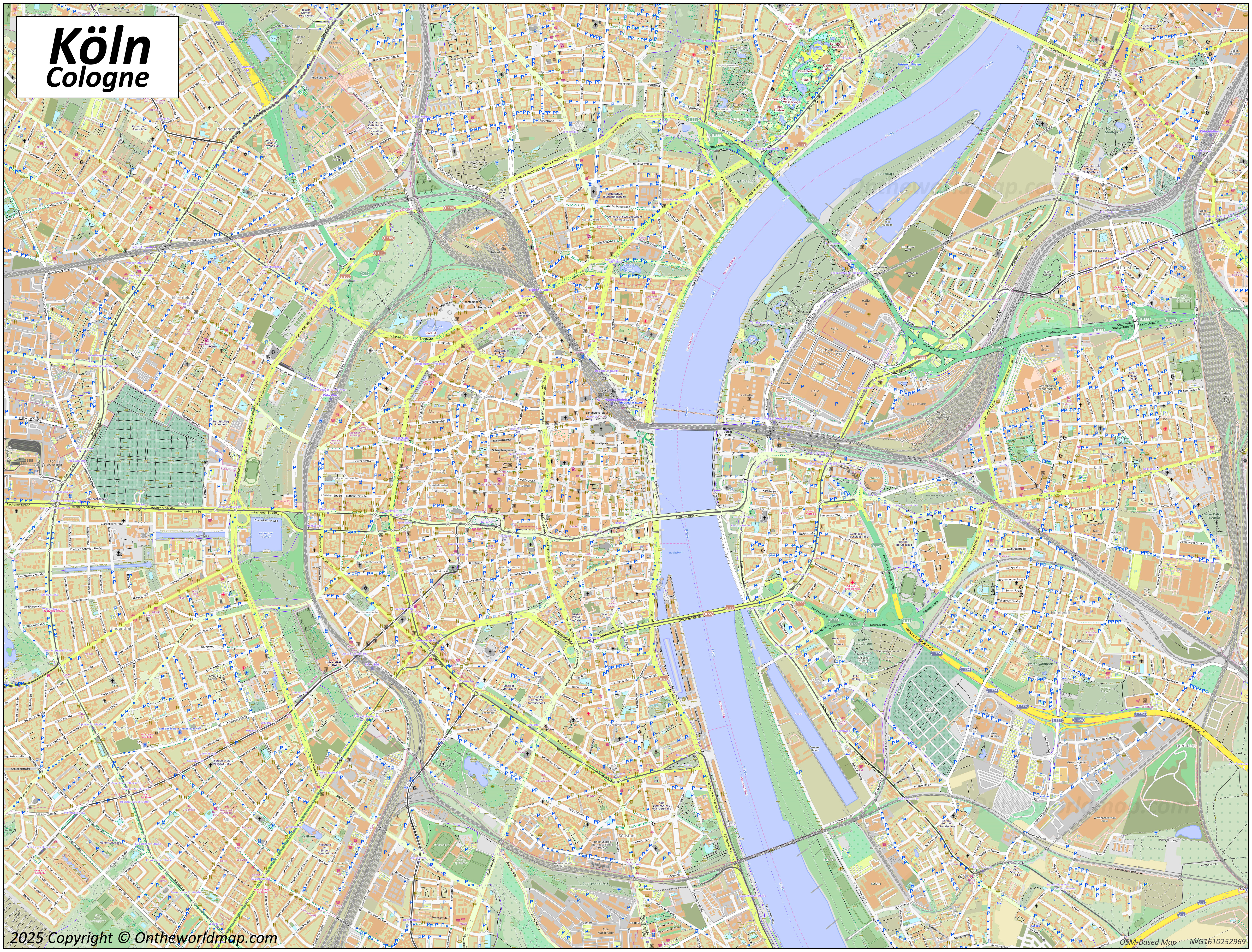 This map shows streets, roads, houses, buildings, restaurants, churches, picnic areas, hospitals, S-Bahn, hauptbahnhof, railway station, parking lots, shops, rivers, and parks in Cologne (Köln).