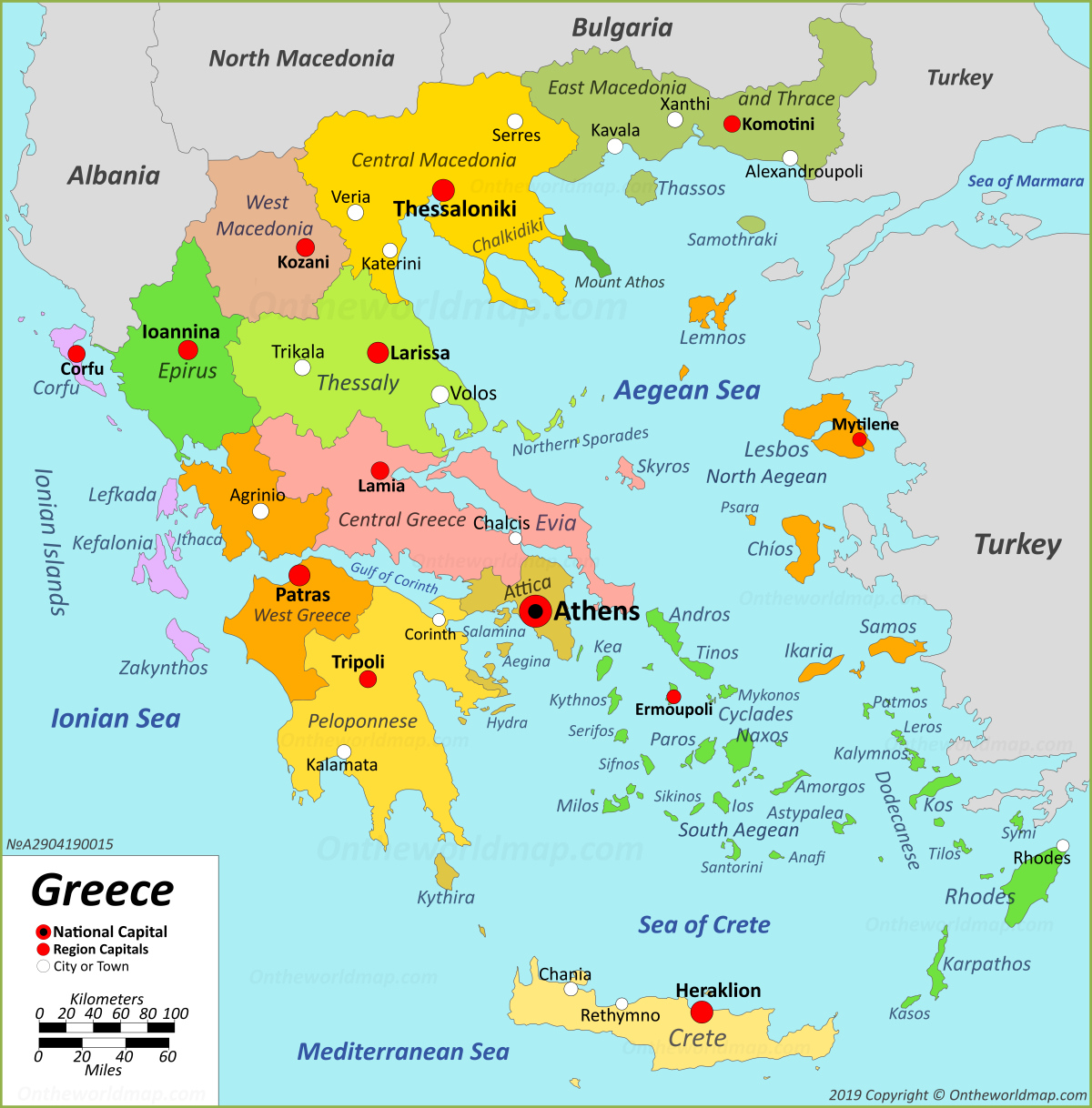 Bordering Countries: Albania, Bulgaria, North Macedonia, and Turkey.Seas: Aegean Sea, Ionian Sea, Sea of Crete, Mediterranean Sea.