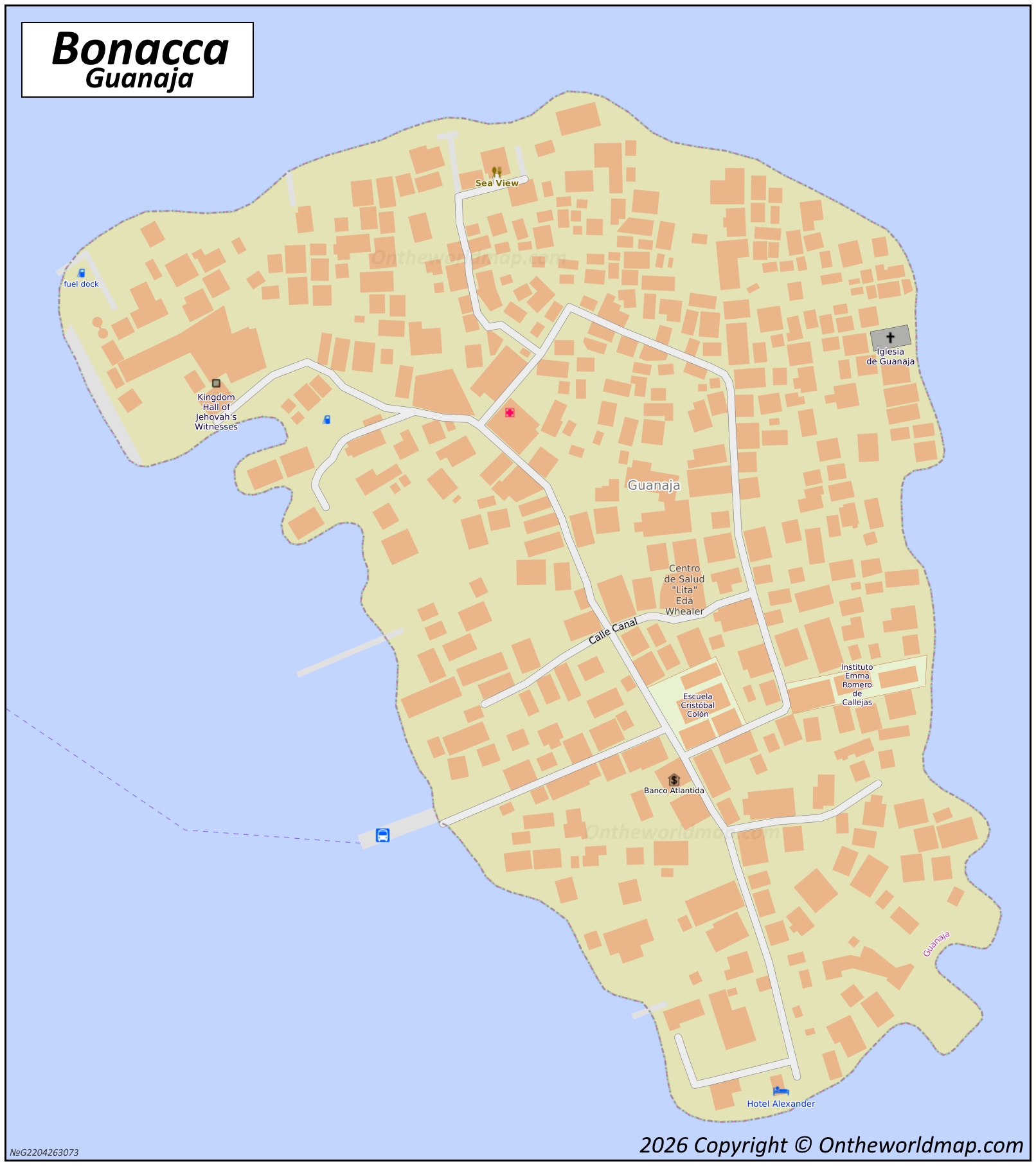 The main settlement is Bonacca, also known as Guanaja Town, which is not located on the main island itself but on a small adjacent cay. The town is known for its extremely high population density and a canal system used for local navigation. Guanaja has a population of approximately 10,000 to 13,000 people, with the majority residing in Bonacca and several smaller coastal communities.
