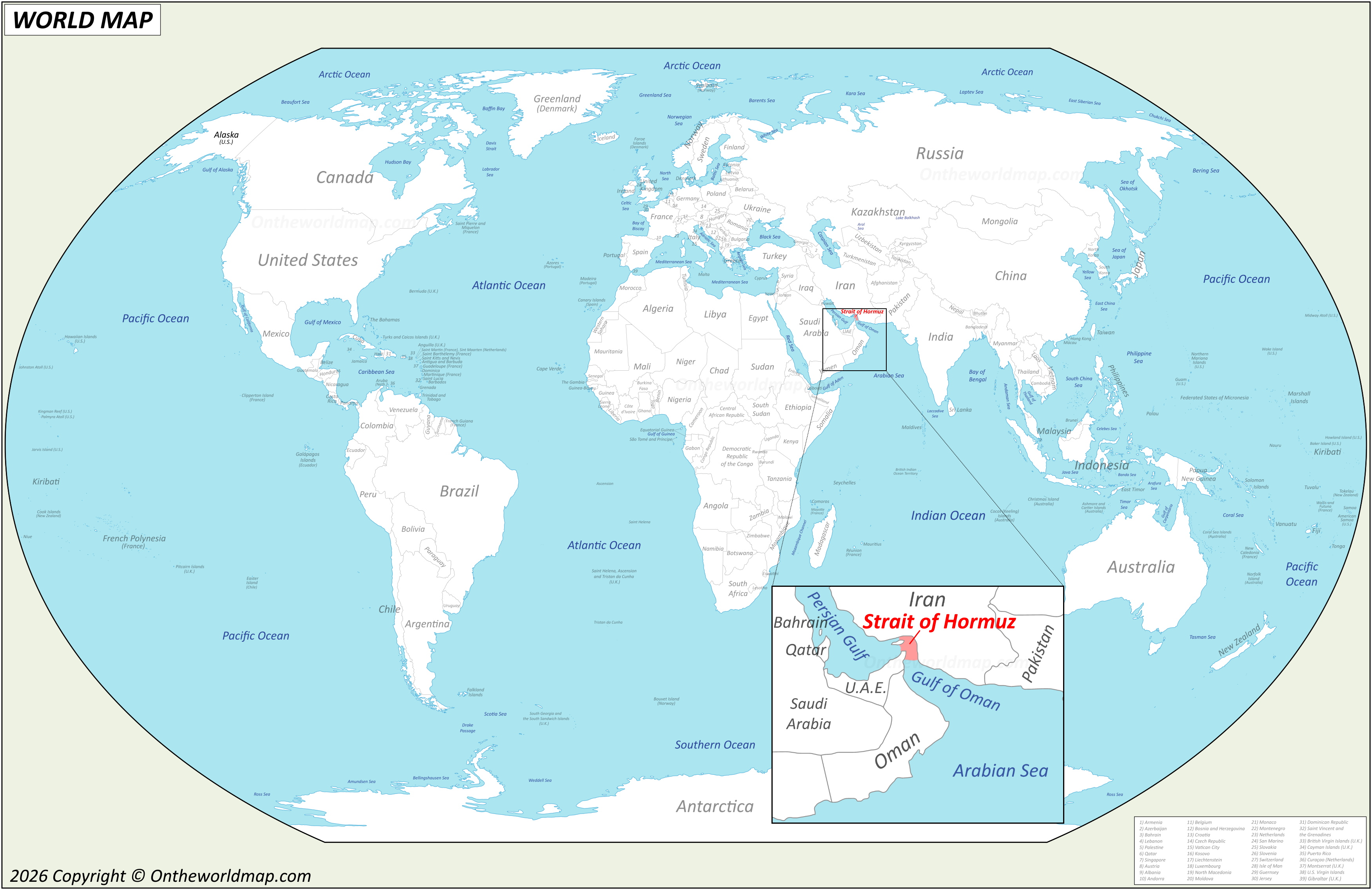 The Strait of Hormuz is a narrow waterway located between the Coasts of Iran to the north and the Musandam Peninsula of Oman and the United Arab Emirates to the south. It connects the Persian Gulf to the Gulf of Oman, which leads to the Arabian Sea and the broader Indian Ocean.