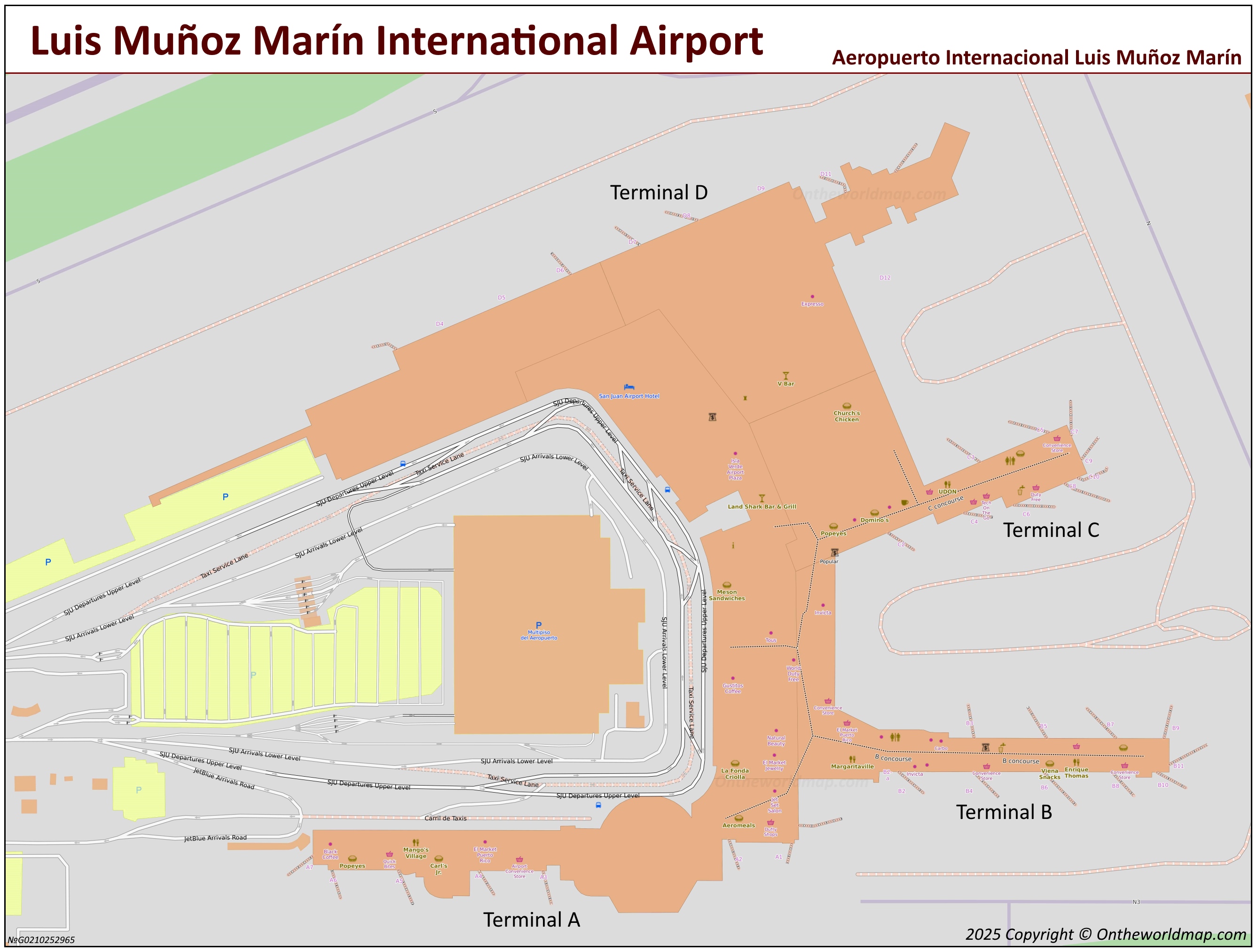 This map shows roads, parking lots, terminals, concourses, gates, restrooms, restaurants, cafes, bars, and shops in Luis Muñoz Marín International Airport.