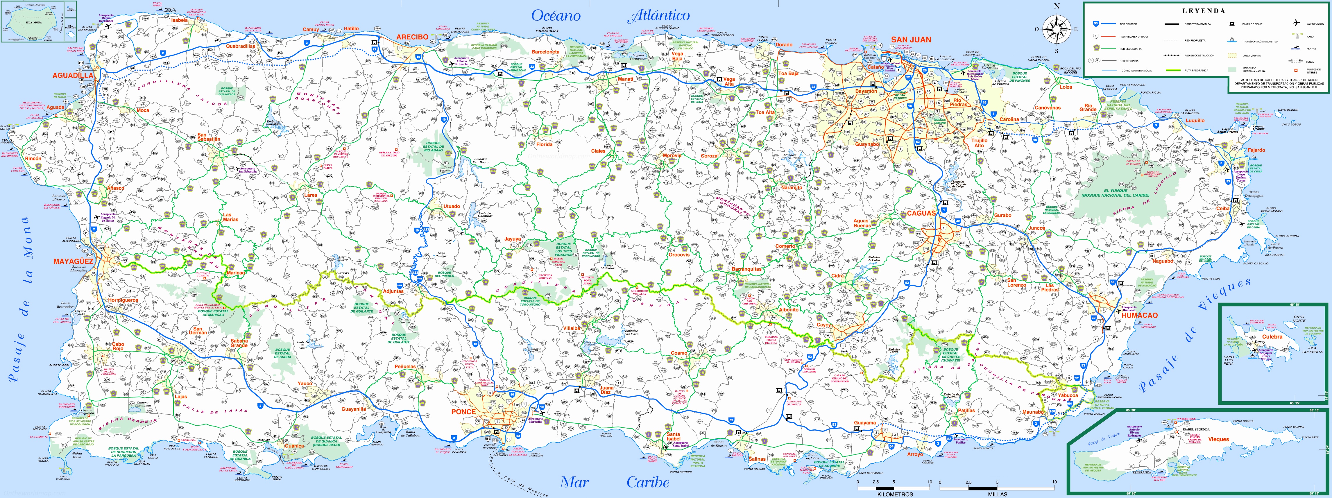 This map shows cities, towns, villages, lakes, rivers, peaks, highways, main roads, secondary roads, airports, lighthouses, parks, beaches, points of interest, and tourist attractions in Puerto Rico.