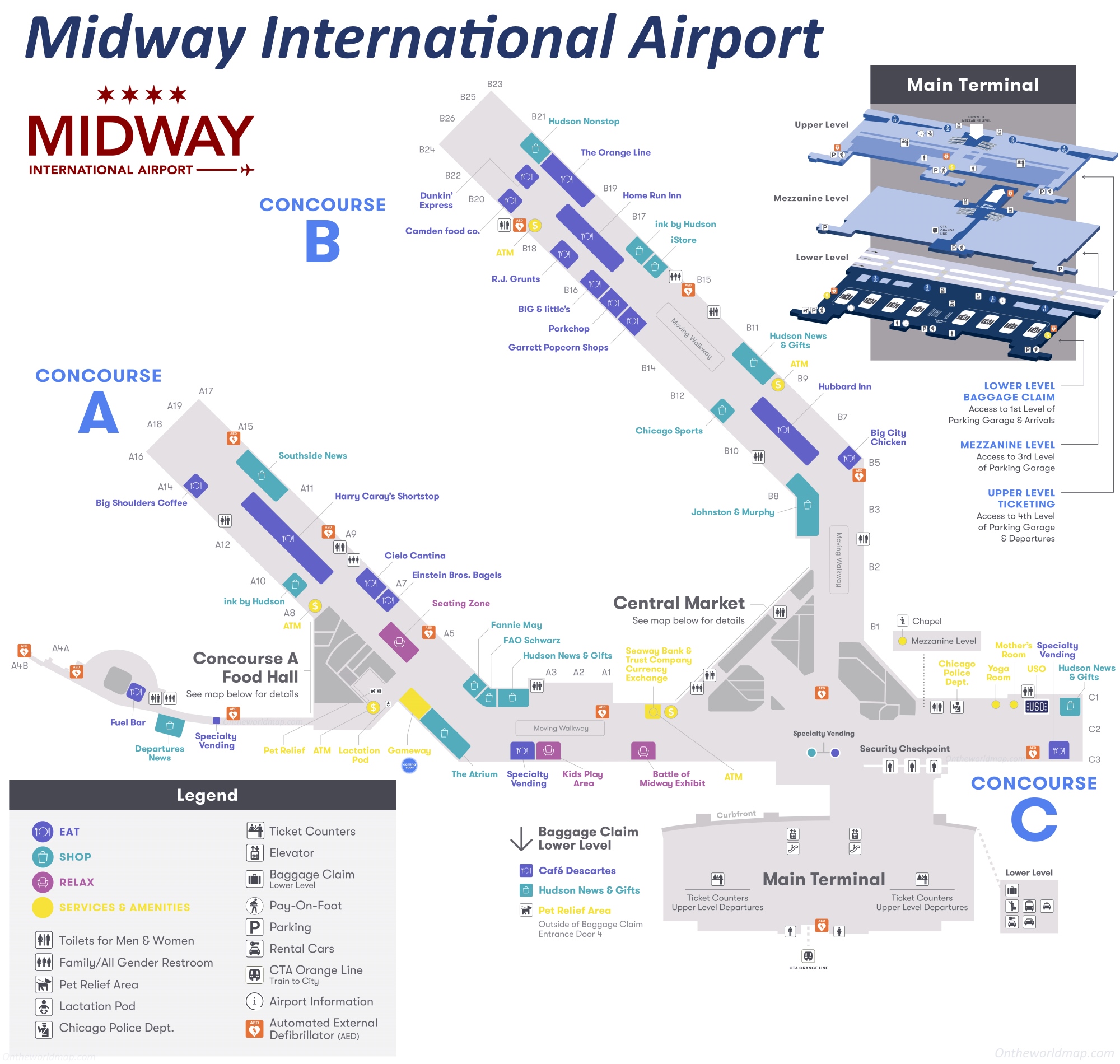 This map shows terminal, concourses, gates, food hall, central market, restaurants, cafes, bars, shops, relax areas, restrooms, pet relief areas, ticket counters, elevators, baggage claims, parking lots, rental cars, and airport information in Midway International Airport.