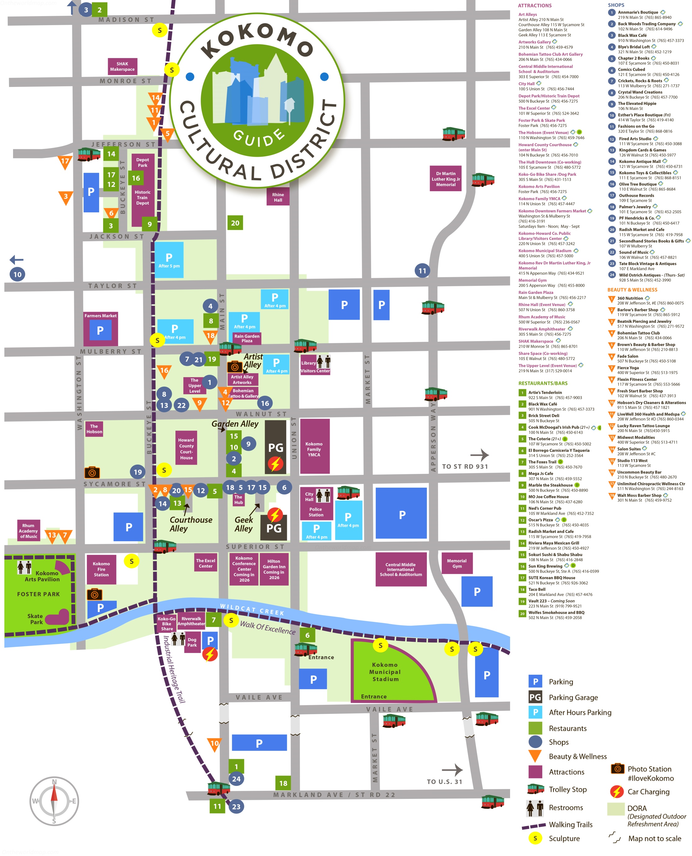 This map shows streets, parking lots, shops, restaurants, cafes, bars, beauty and wellness, trolley stops, restrooms, walking trails, sculptures, car charging, museums, and attractions in Kokomo.