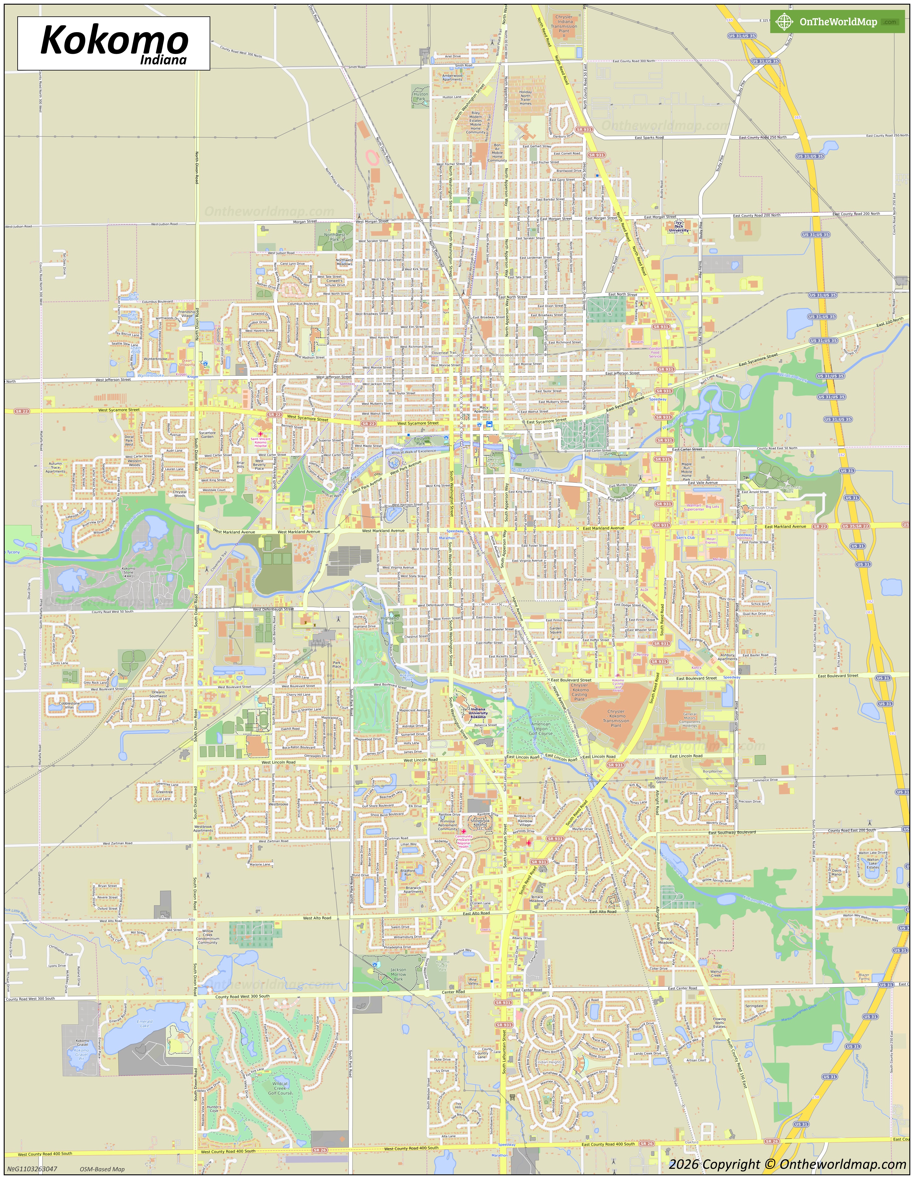 This map shows streets, roads, hospitals, golf courses, lakes, rivers, buildings, railways, railway stations, and parks in Kokomo.