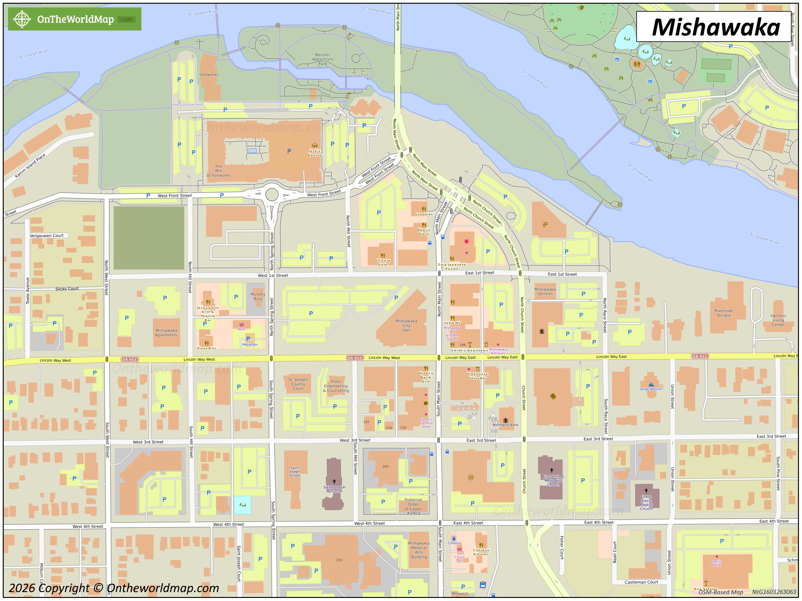 This map shows streets, trails, houses, buildings, cafes, bars, restaurants, hotels, restrooms, parking lots, shops, churches, points of interest, viewpoints, playgrounds, picnic areas, and parks in Downtown Mishawaka.