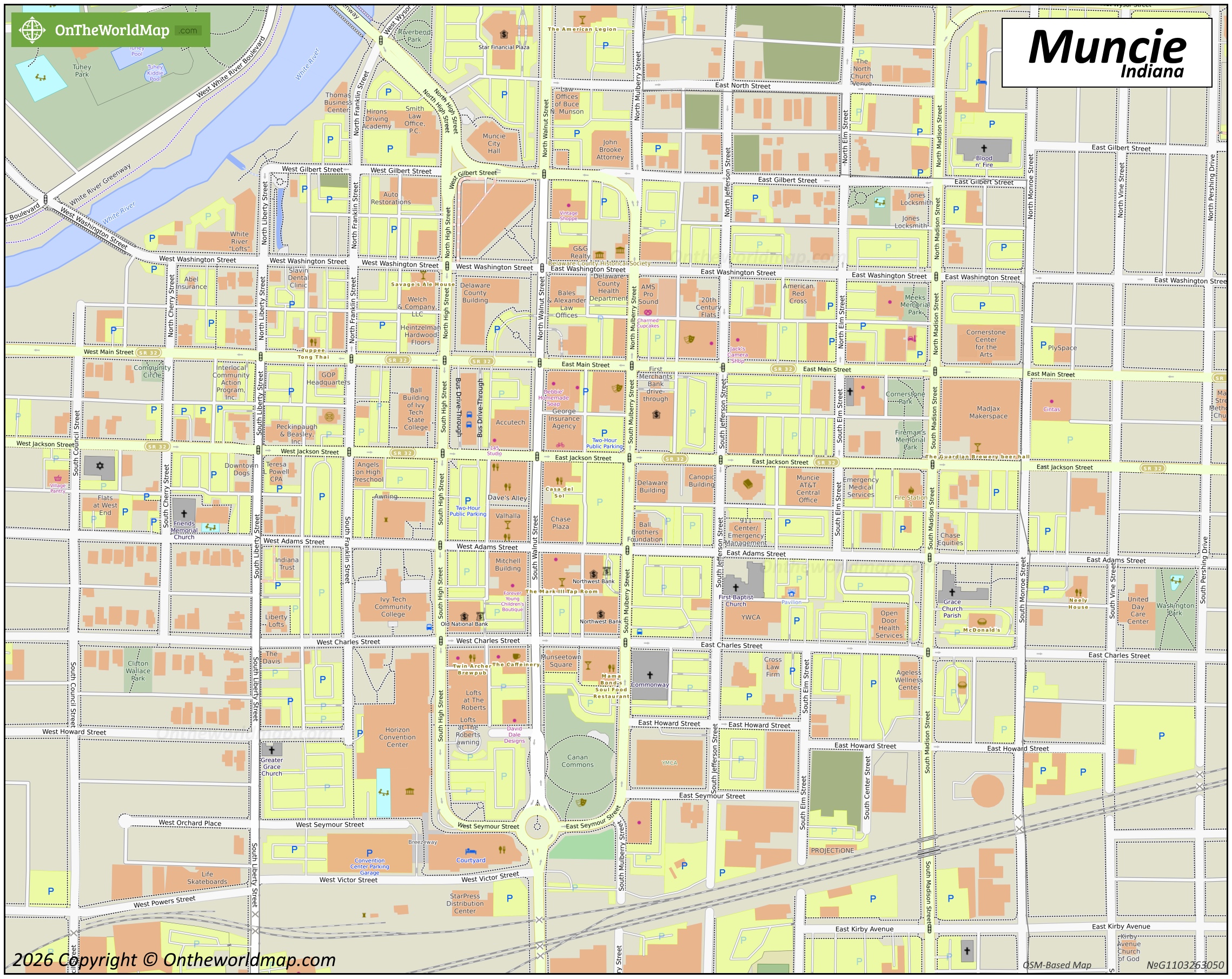 This map shows streets, trails, houses, buildings, cafes, bars, restaurants, hotels, playgrounds, parking lots, shops, churches, museums, points of interest, and parks in Downtown Muncie.