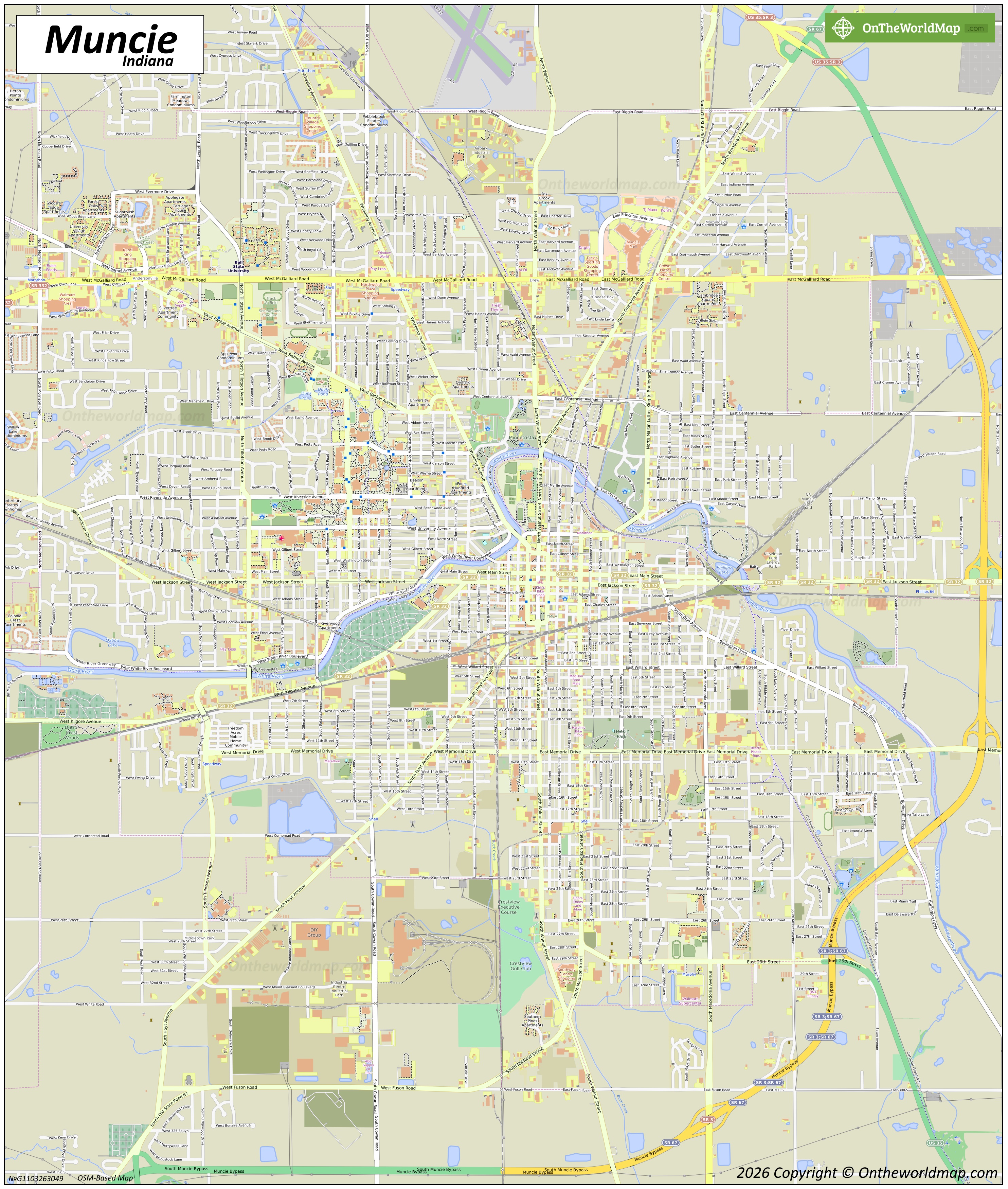 This map shows streets, roads, beaches, golf courses, lakes, rivers, buildings, railways, railway stations, and parks in Muncie.
