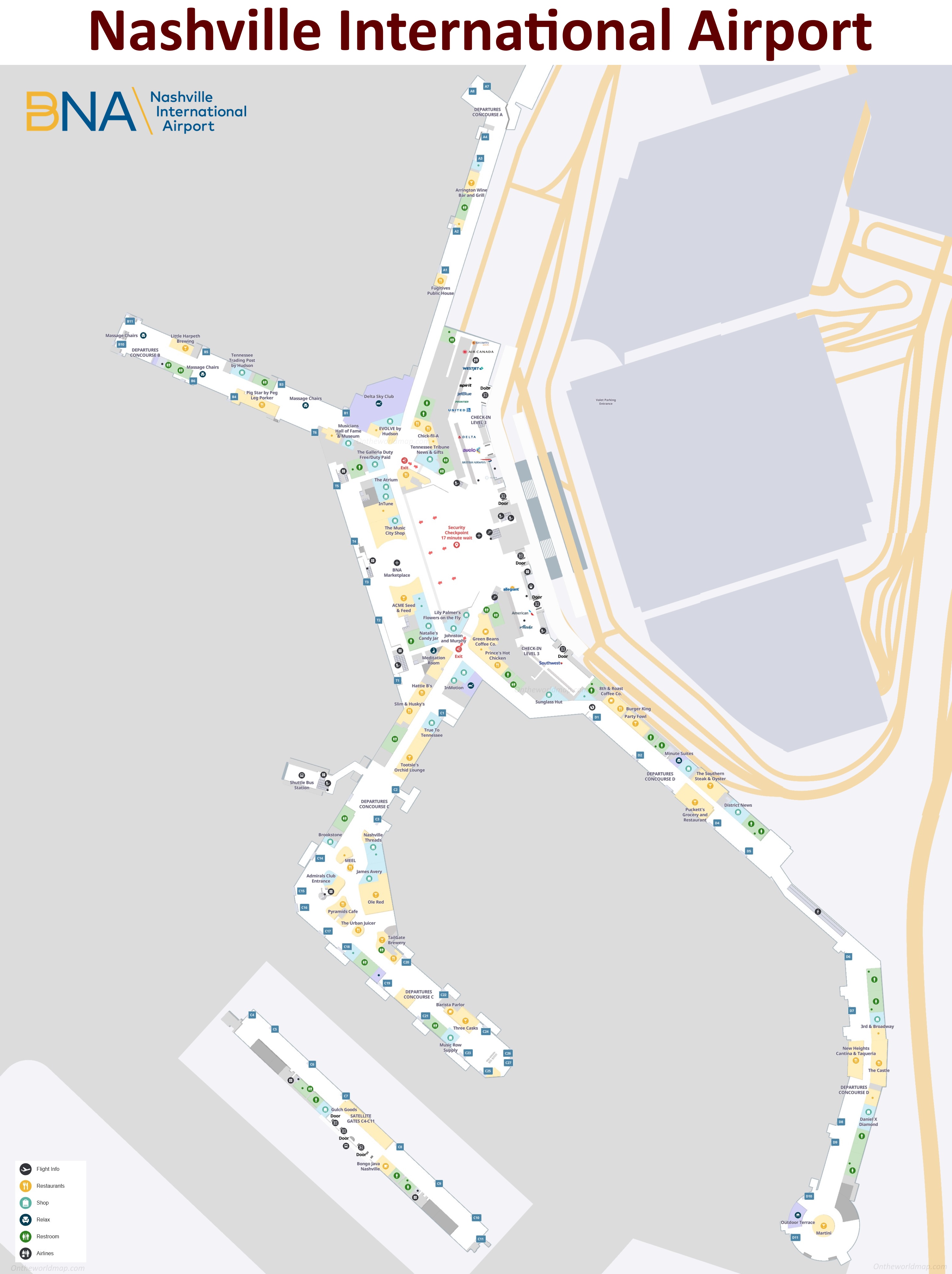 This map shows terminals, gates, doors, restrooms, rental cars, restaurants, bars, shops, relax, airlines, and security checkpoints in Nashville International Airport.