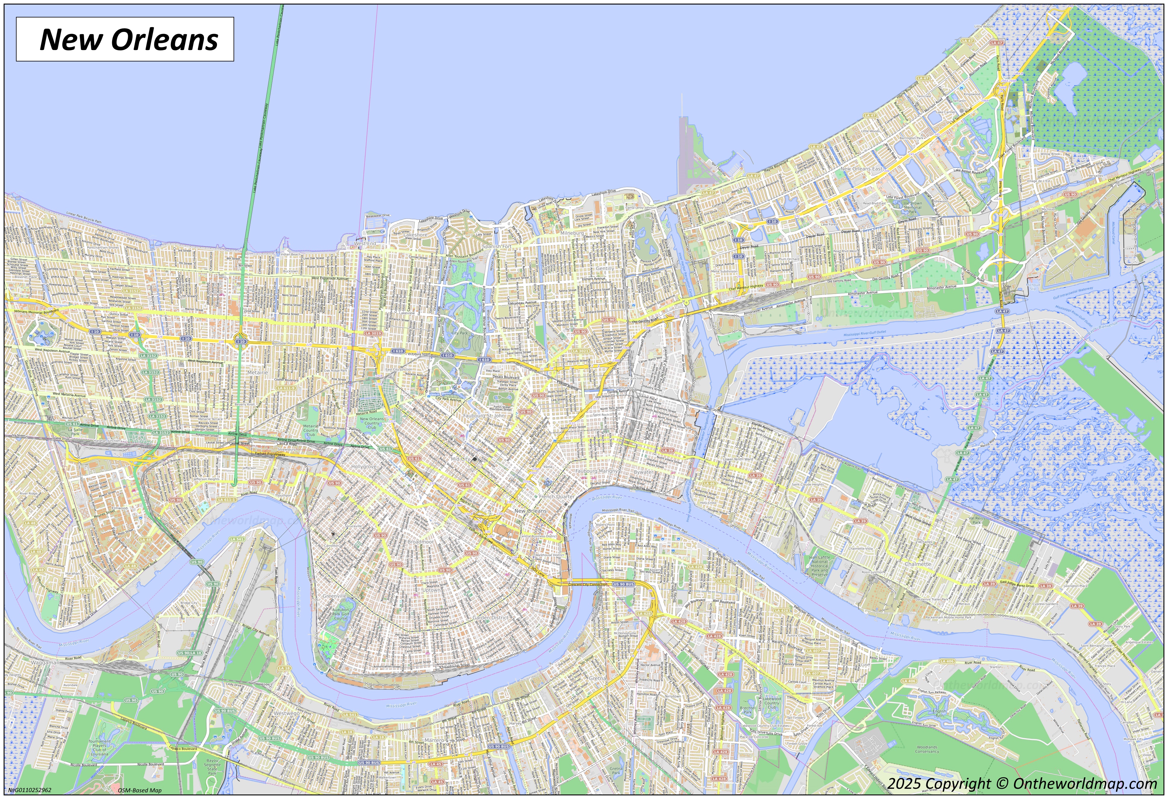 This map shows neighborhoods, rivers, streets, roads, trails, golf courses, lakes, rivers, buildings, airports, railways, railway stations, and parks in New Orleans.