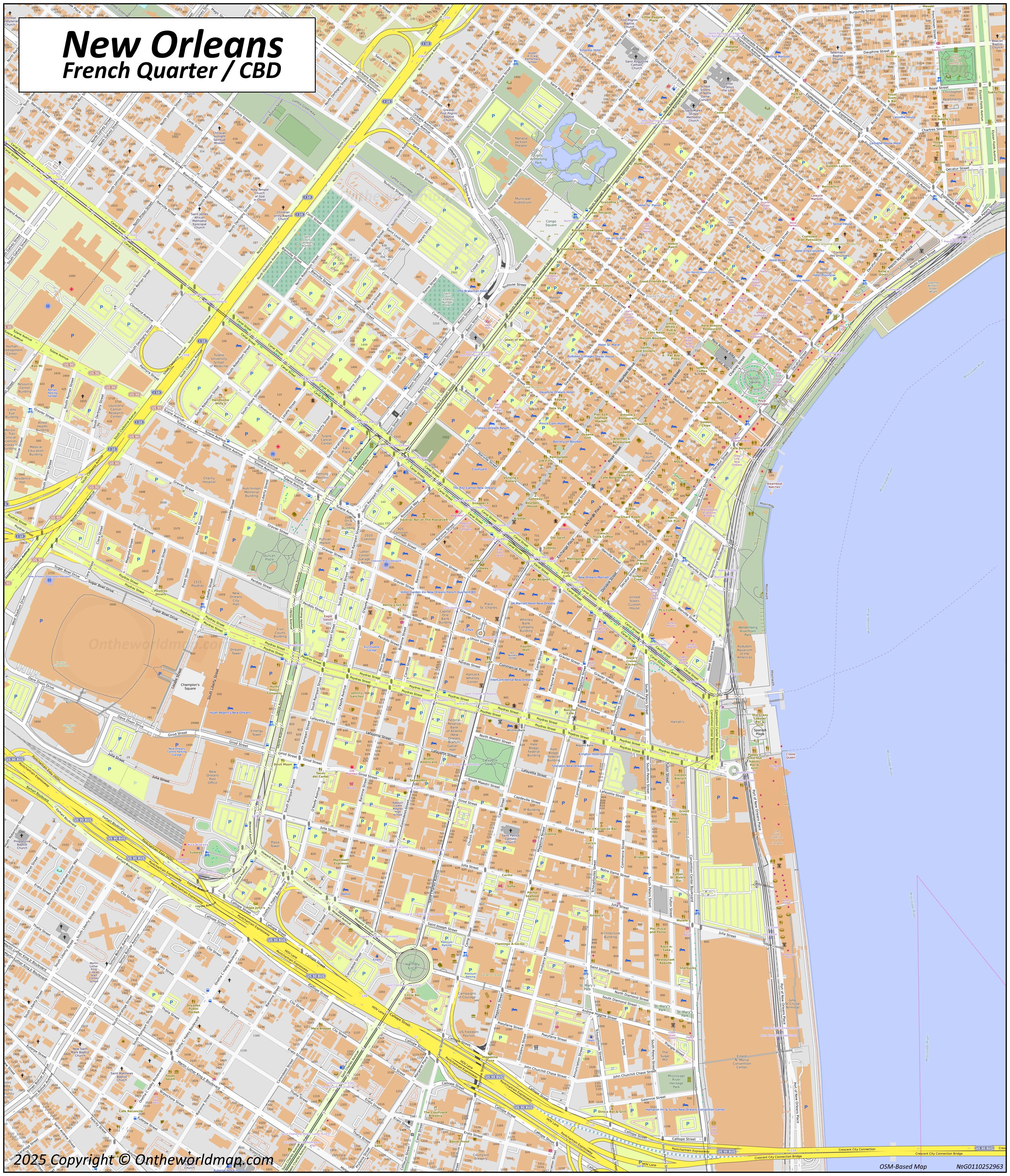 This map shows streets, trails, restrooms, houses, buildings, cafes, bars, restaurants, museums, hotels, monuments, parking lots, shops, churches, theaters, streetcar routes and stops, points of interest, ferries, and parks in Downtown New Orleans.