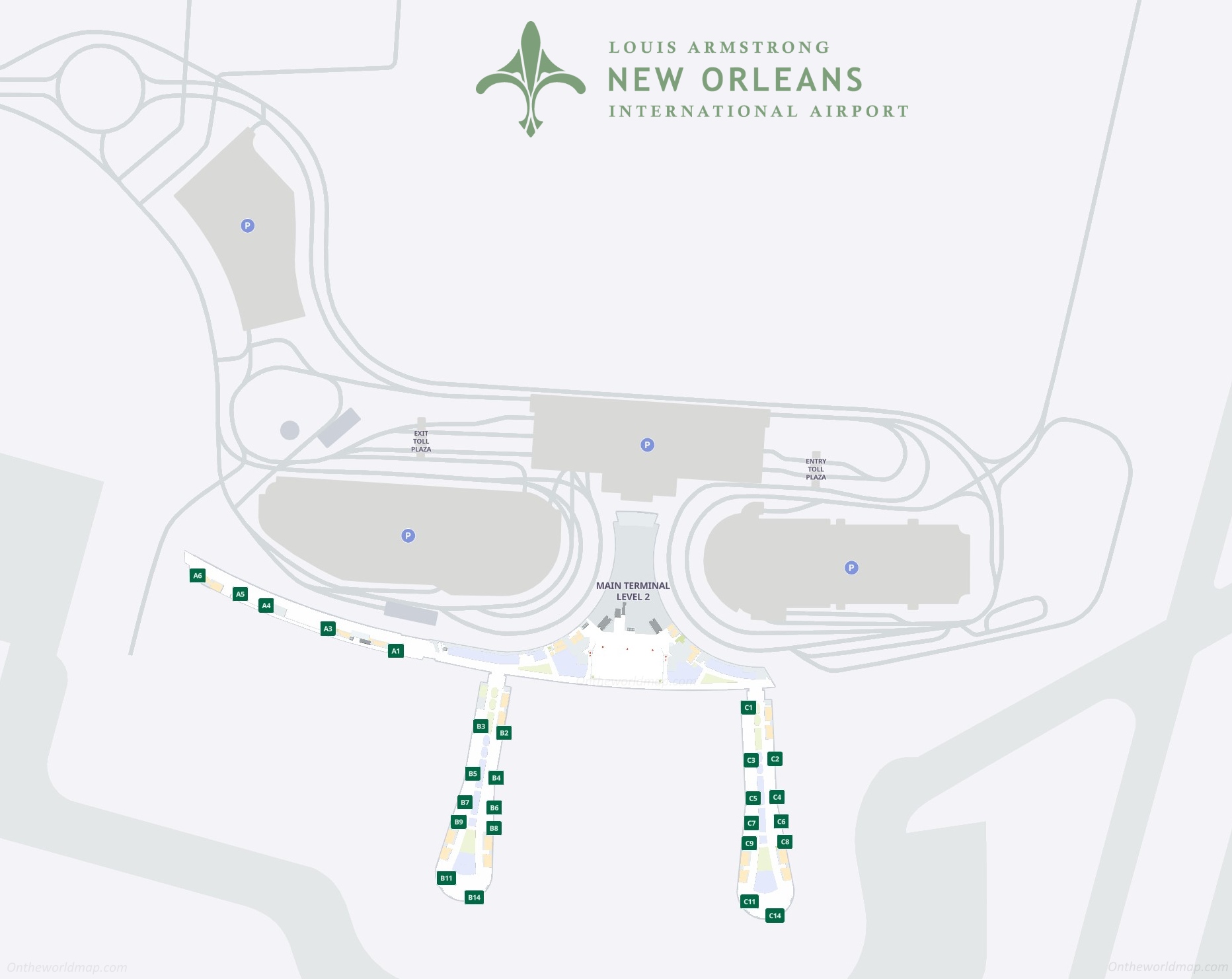 This map shows terminal, roads, concourses, gates, and parking lots in Louis Armstrong New Orleans International Airport.