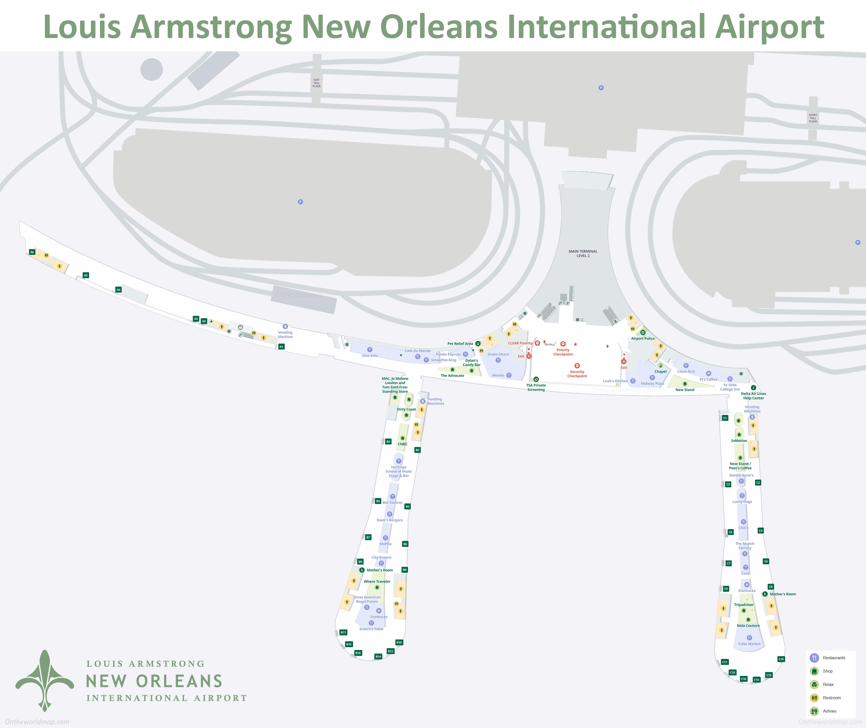 This map shows terminal, concourses, gates, doors, exits, parking lots, airlines, restaurants, cafes, bars, restrooms, security checkpoints, shops, stairs, and escalators in Louis Armstrong New Orleans International Airport.