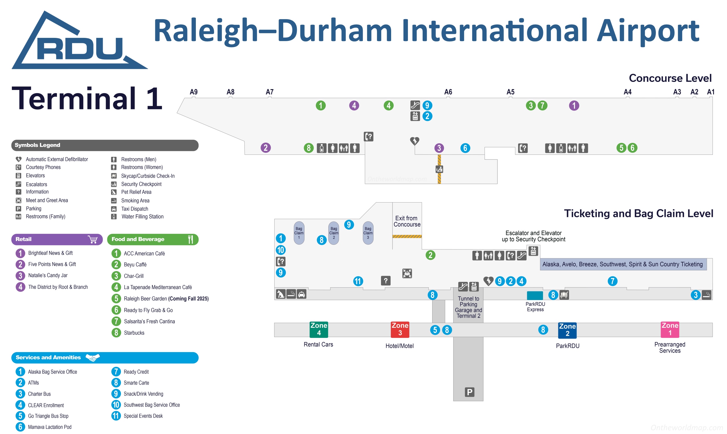This map shows terminals, gates, shops, restrooms, parking lots, and restaurants in Raleigh–Durham International Airport.