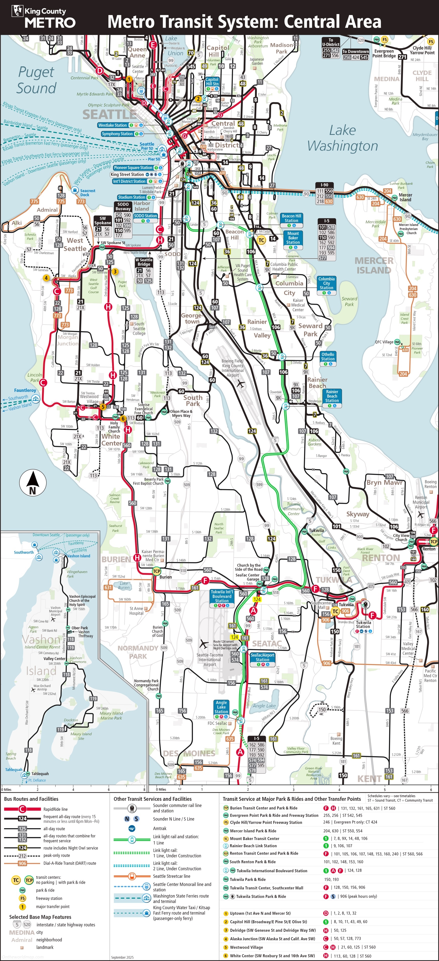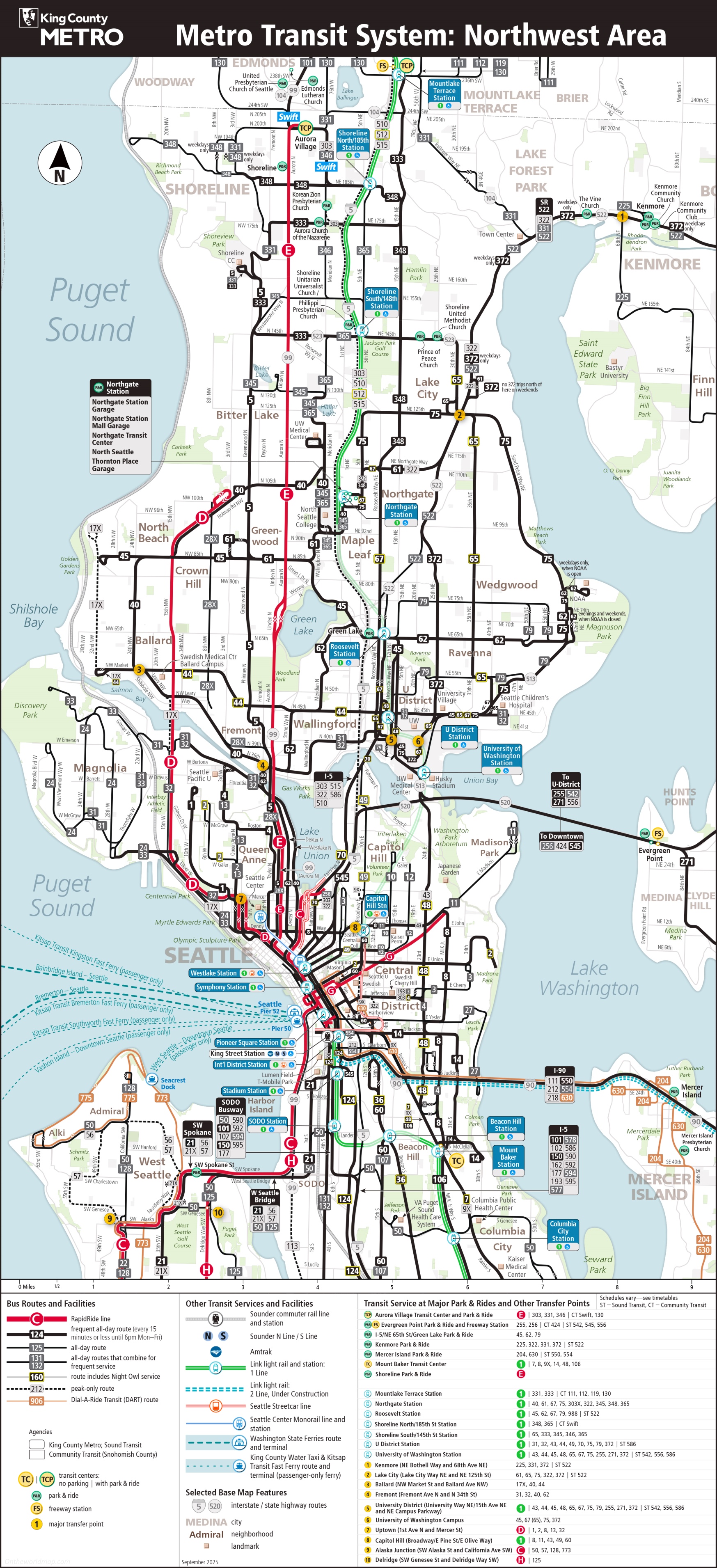 This map shows rapidride line and stop, frequent all-day route, all-day route, all-day routes that combine for frequent service, peak-only route, school route, demand area response transit: route and flexible service area, community shuttle: route and flexible service area, metro transit route, sound transit regional express route, community transit (snohomish county) or pierce transit (pierce county) route, transit center, transit center and park & ride, park & ride lot with more than 250 spaces, park & ride lot with less than 250 spaces, freeway station, downtown seattle transit tunnel station, bus and light rail, transit tunnel station, bus only, major transfer point, sounder commuter rail line and station, link light rail line and station, seattle streetcar line, seattle center monorail line and station, washington state ferries route and terminal, king county water taxi route and terminal (passenger-only ferry), long-distance bus company station, and amtrak passenger rail station in King County.