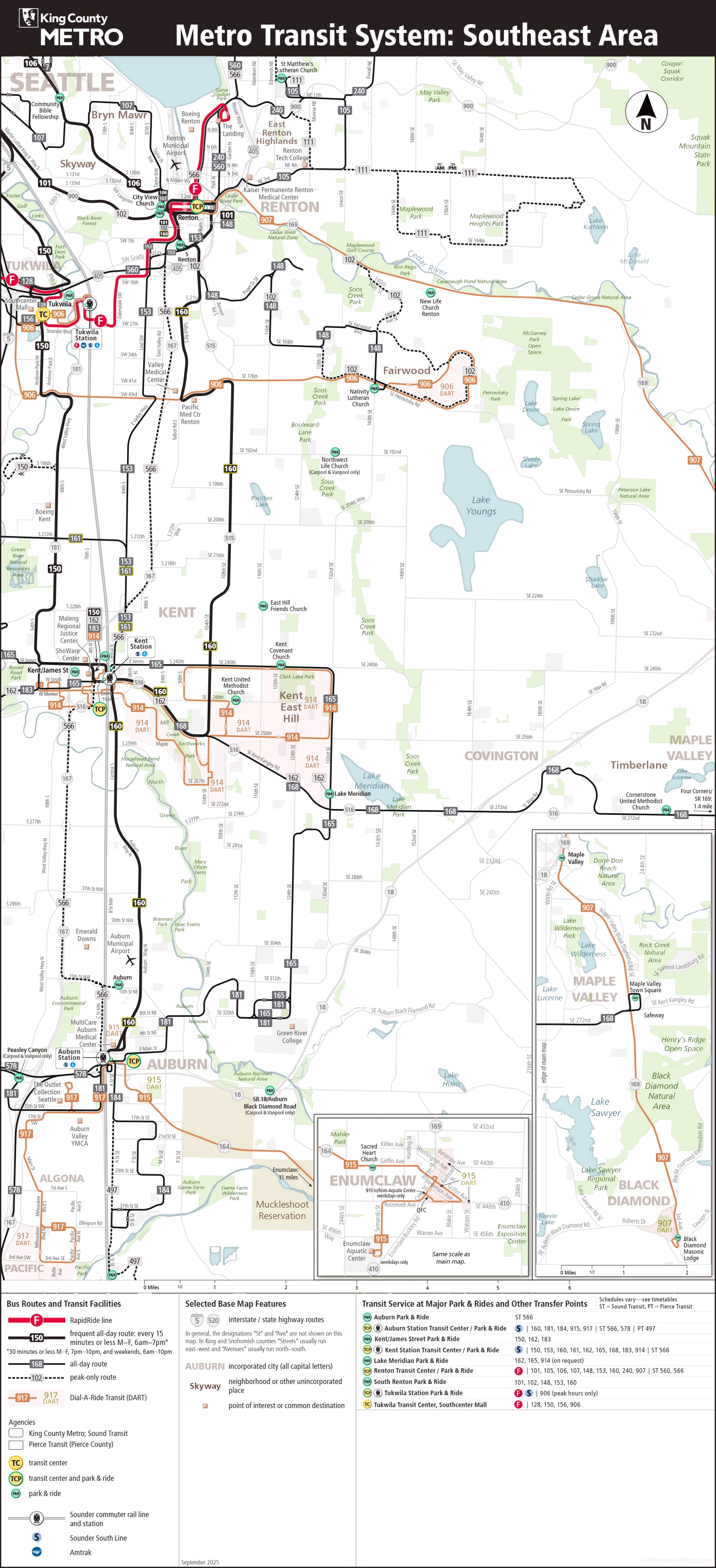 This map shows rapidride line, frequent all-day route: every 15 minutes or less m–f 6am–7pm, all-day route, peak-only route, dial-a-ride transit (dart), king county metro, sound transit, pierce transit (pierce county), transit center, transit center and park & ride, park & ride, sounder commuter rail line and station, sounder south line, amtrak in King County Southeast Area.