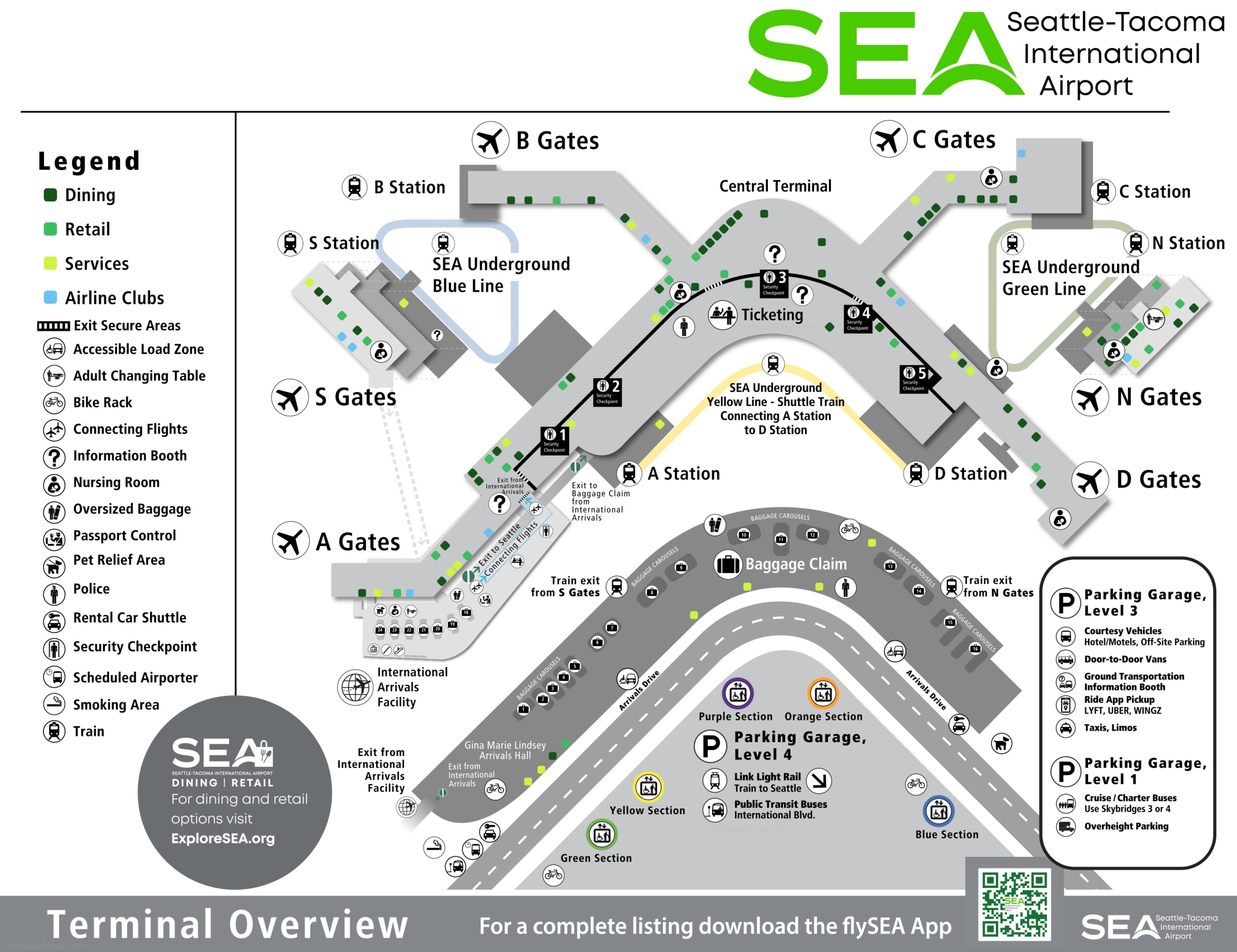 This map shows terminal, gates, dining, retail, services, airline clubs, exit secure areas, accessible load zone, adult changing table, bike rack, connecting flights, information booth, nursing room, oversized baggage, passport control, pet relief area, police, rental car shuttle, security checkpoint, scheduled airporter, smoking area, train, parking garage, level 3, courtesy vehicles: hotel/motels, off-site parking, door-to-door vans, ground transportation information booth, ride app pickup (lyft, uber, wingz), taxis, limos, parking garage, level 1, cruise / charter buses (use skybridges 3 or 4), overnight parking in Seattle Tacoma International Airport.