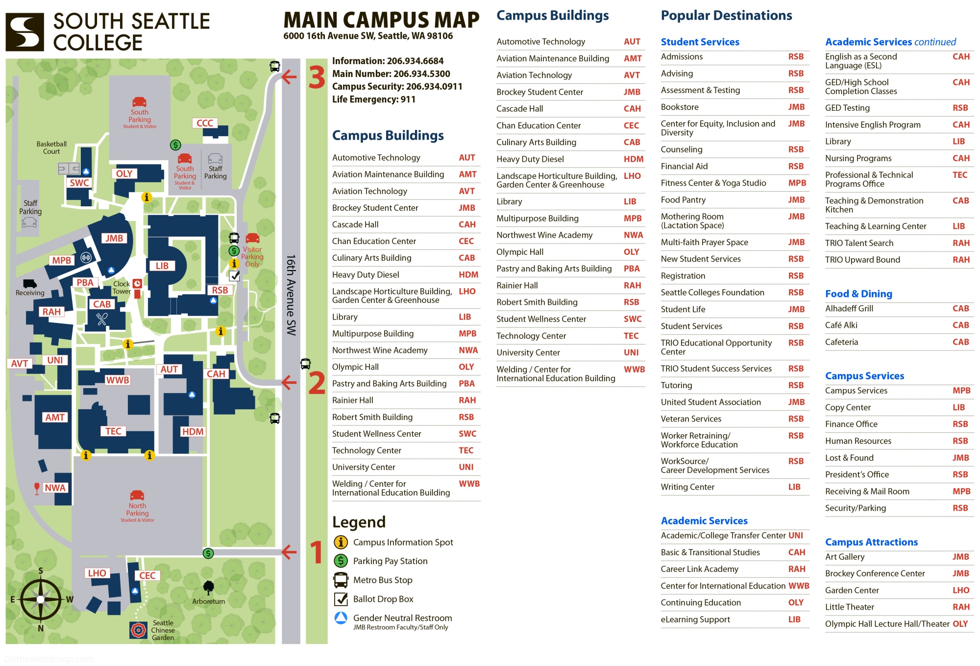 This map shows buildings, halls, campus information spots, parking pay stations, metro bus stops, restrooms, and services on the campus of South Seattle College.