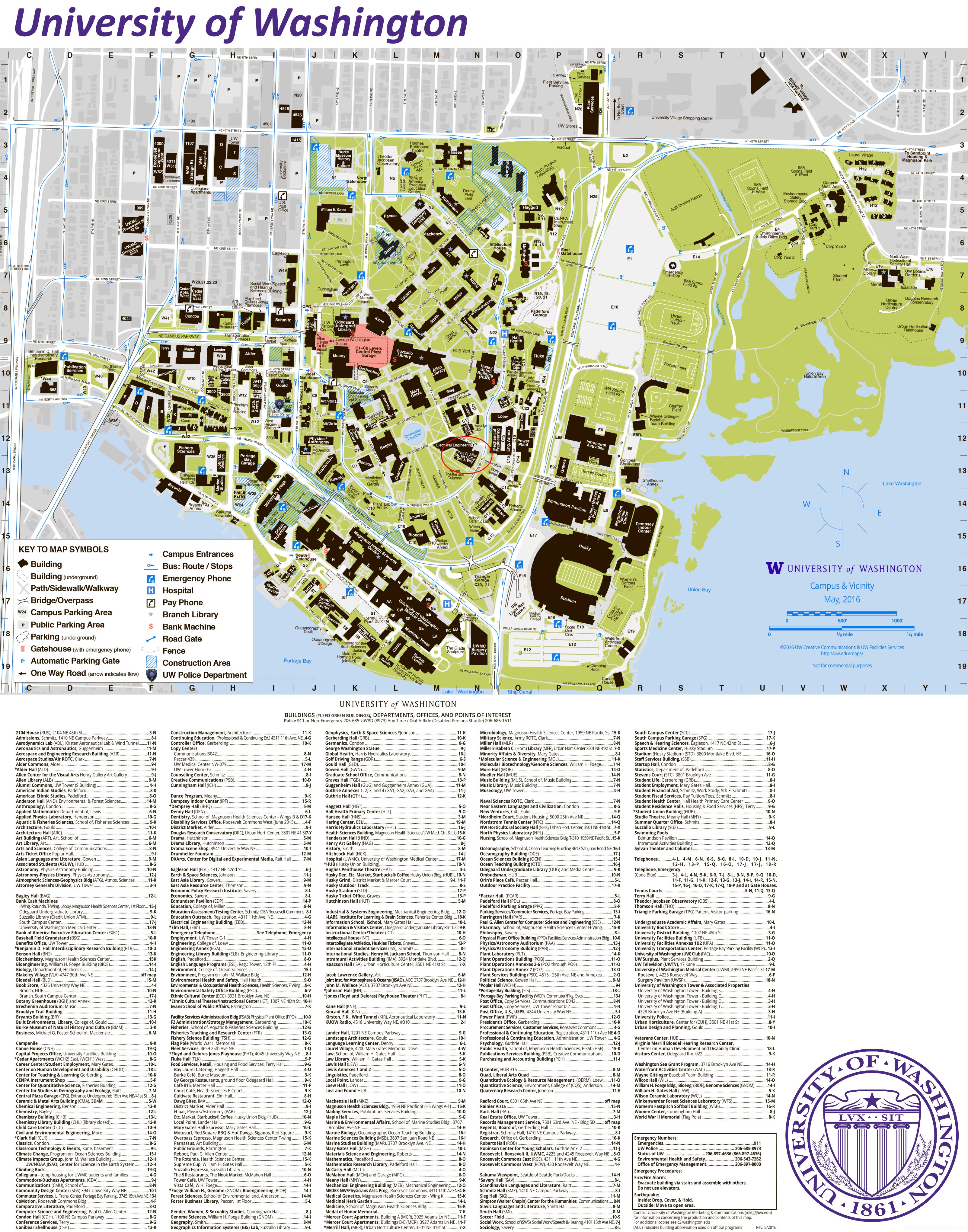 This map shows buildings, buildings (underground), path/sidewalk/walkways, bridges/overpass, campus parking areas, public parking areas, parking (underground), gatehouse (with emergency phone), automatic parking gates, one way road (arrow indicates flow), campus entrances, bus: route / stops, emergency phone, hospital, pay phone, branch library, bank machine, road gate, fence, and construction area on the campus of University of Washington.