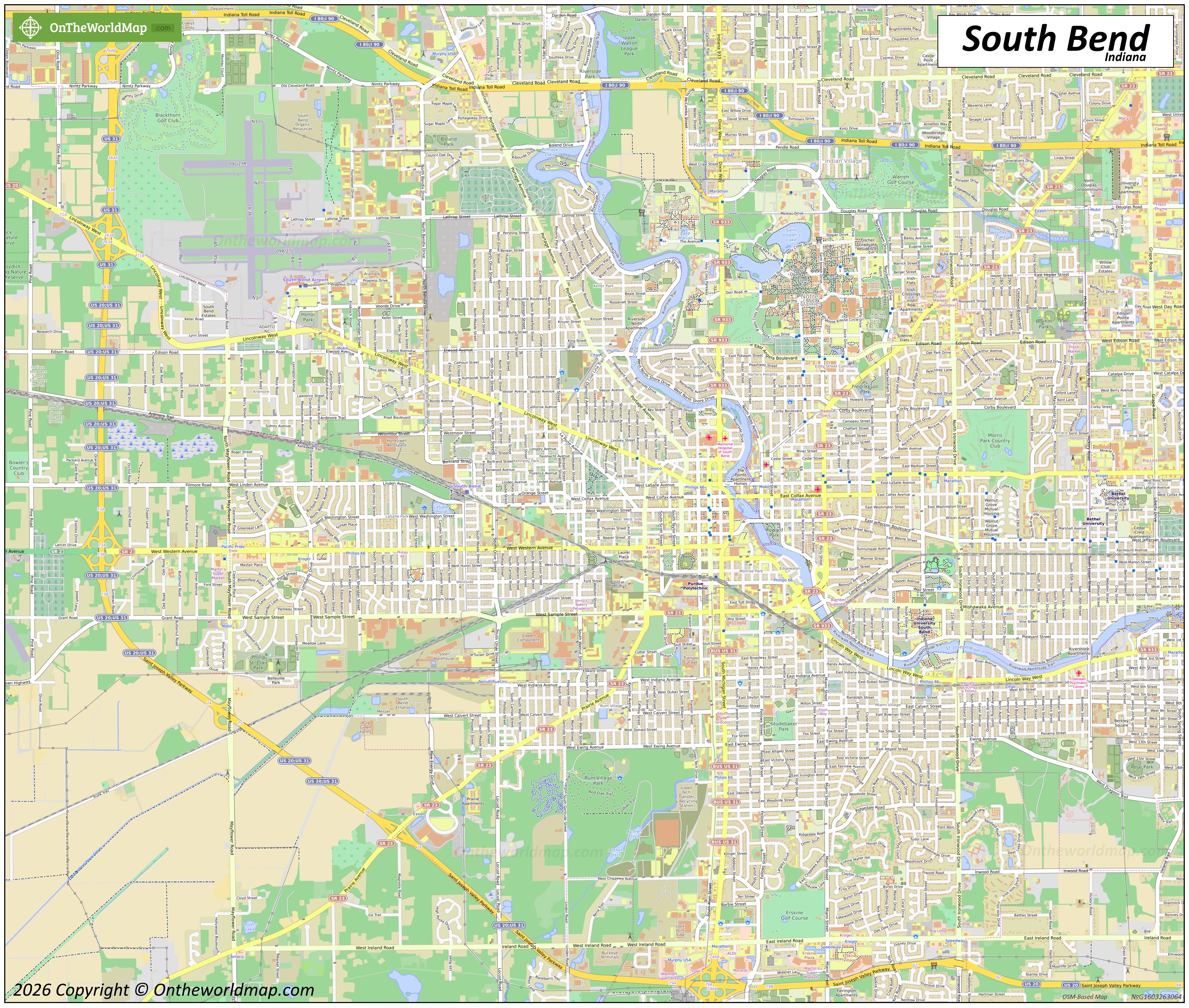 This map shows neighborhoods, streets, roads, golf courses, lakes, rivers, buildings, hospitals, airport, railways, railway stations, and parks in South Bend.