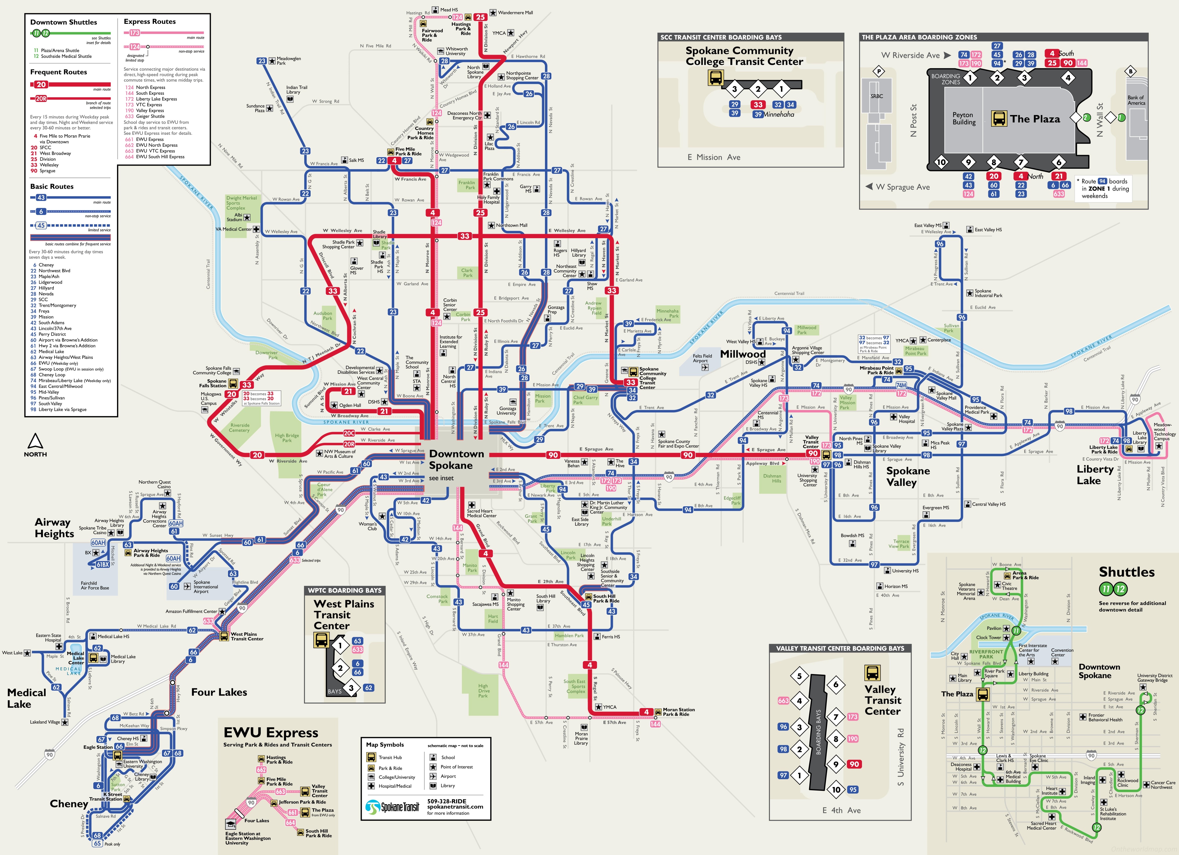 This map shows Downtown shuttles, express routes, frequent routes, basic routes, park and ride, and transit hub in Spokane.