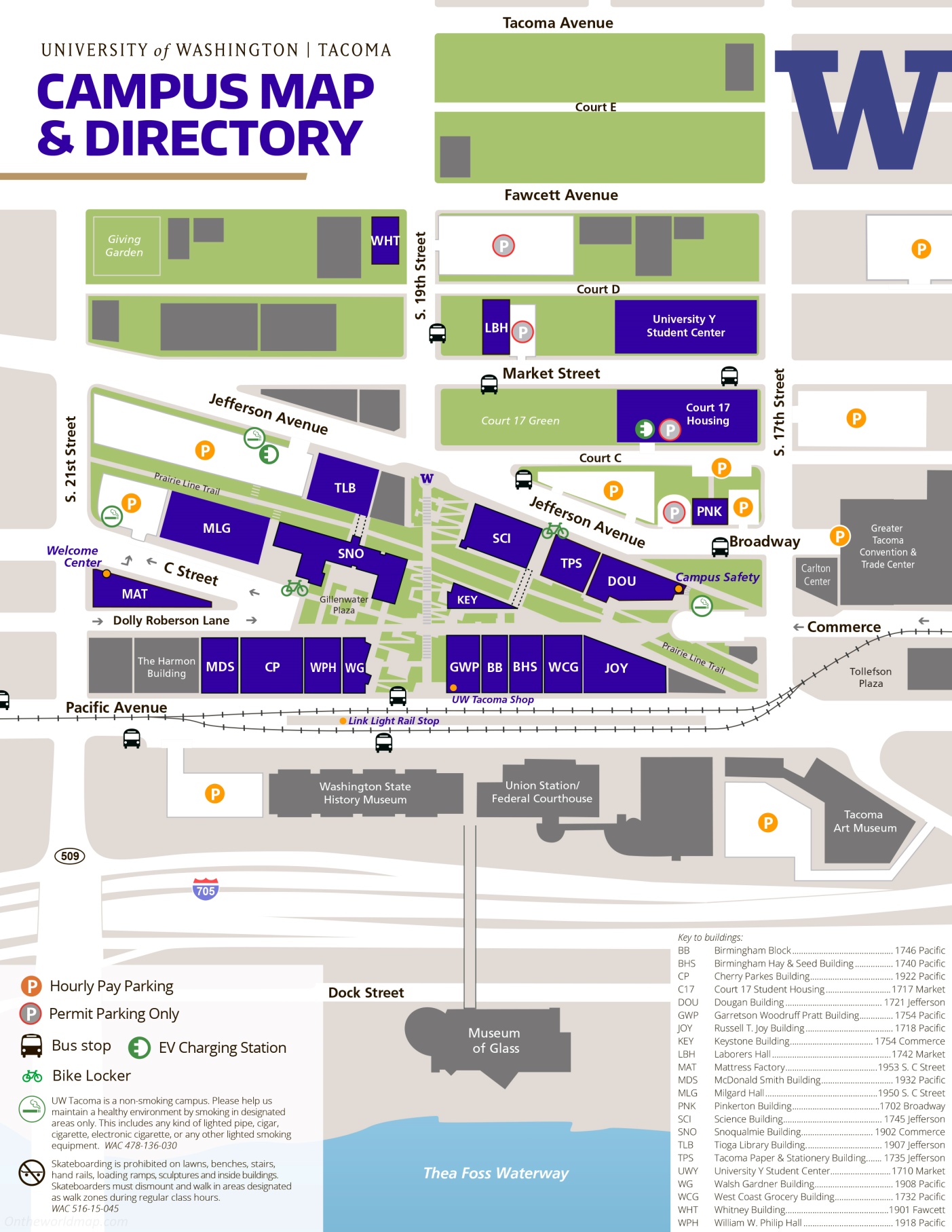 This map shows streets, roads, buildings, parking lots, bus stops, bike locker, EV charging stations, link rail stop, and welcome center on the Tacoma Campus of University of Washington.