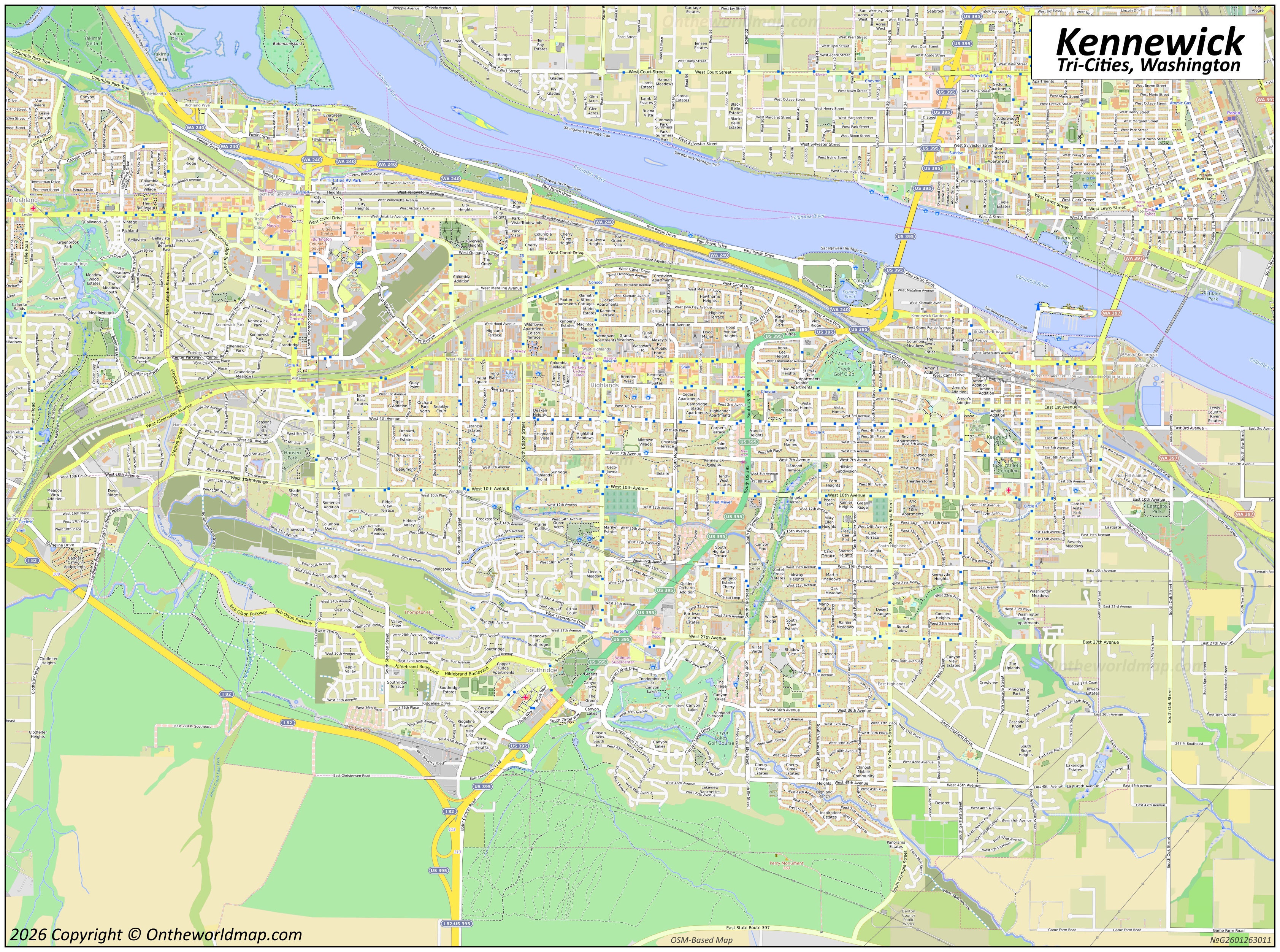 This map shows neighborhoods, streets, roads, trails, golf courses, rivers, buildings, hospitals, railways, railway stations, and parks in Kennewick.
