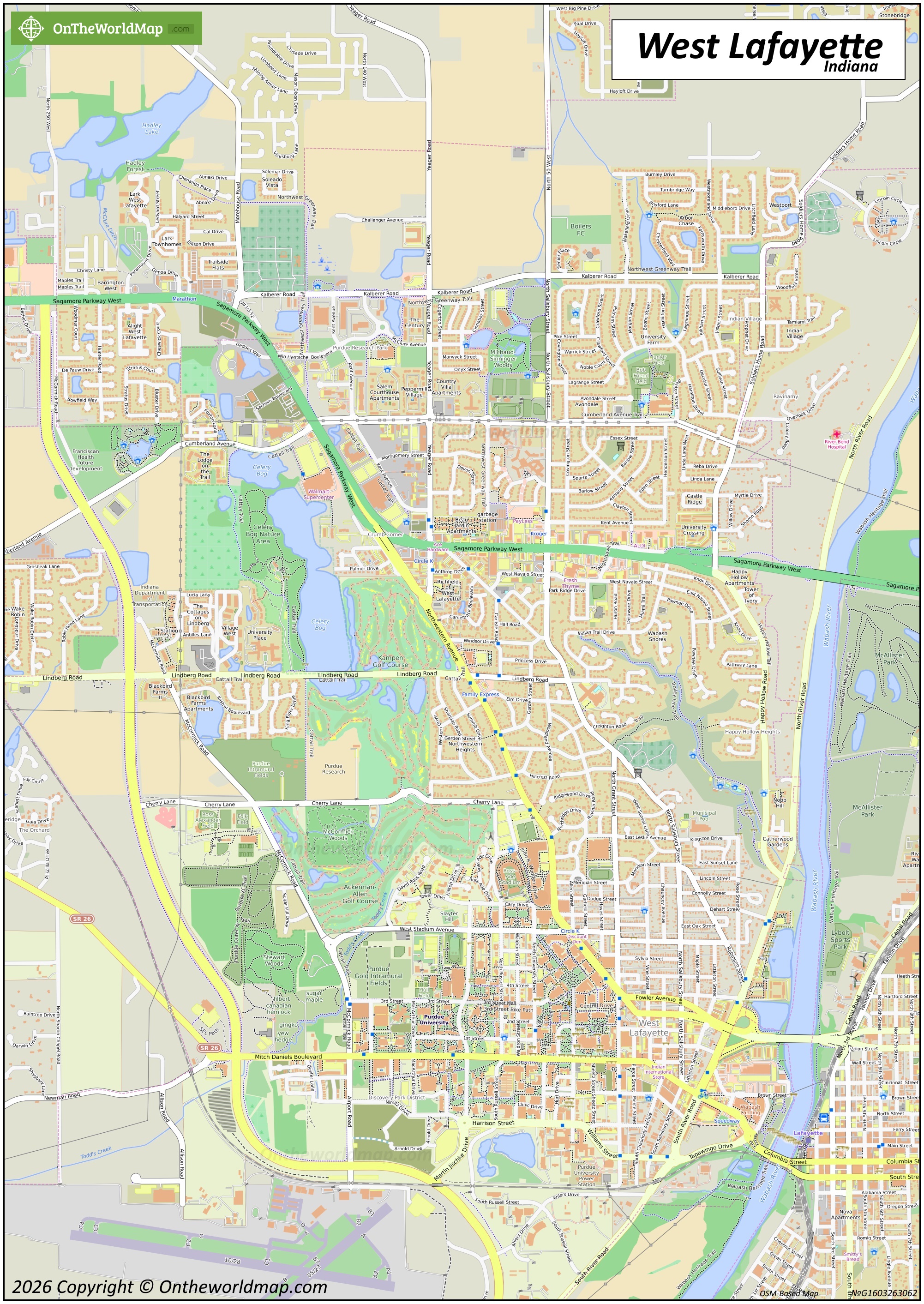This map shows streets, roads, trails, hospitals, golf courses, lakes, rivers, buildings, railways, railway stations, and parks in West Lafayette.