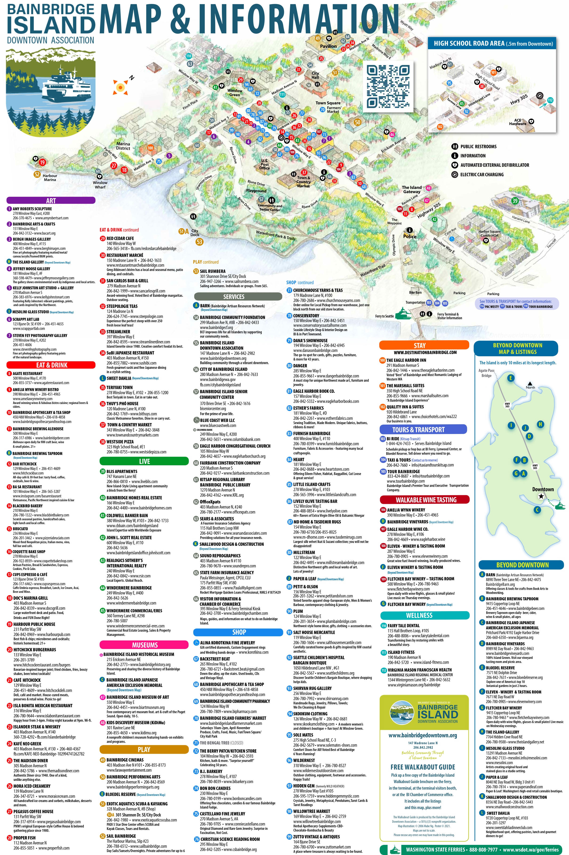 This map shows streets, cafes, bars, restaurants, points of interest, galleries, public toilets, hotels, and information centers in Bainbridge Island.