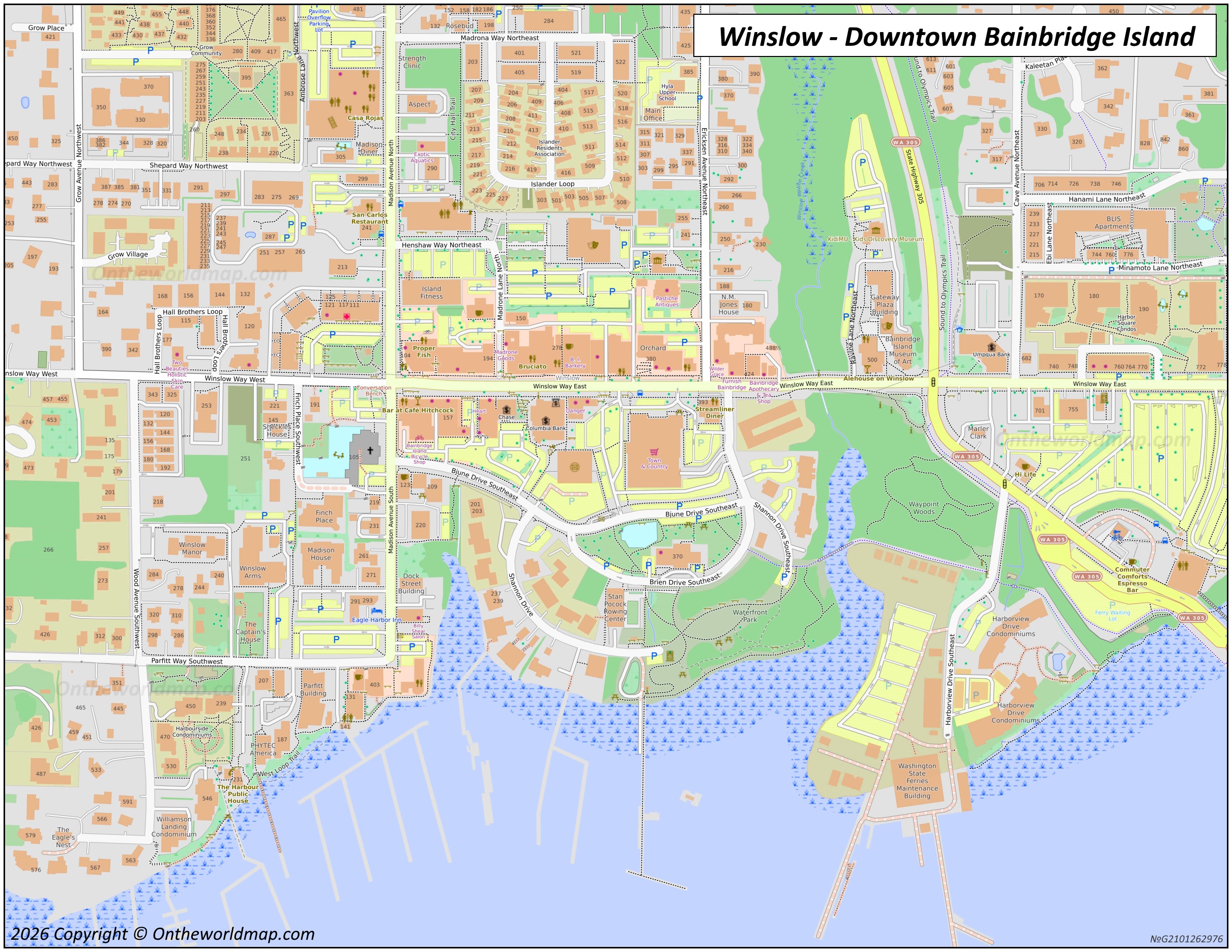 This map shows streets, trails, picnic areas, piers, houses, buildings, playgrounds, cafes, bars, restaurants, hotels, parking lots, shops, churches, points of interest, museums, public toilets, and parks in Downtown Bainbridge Island.