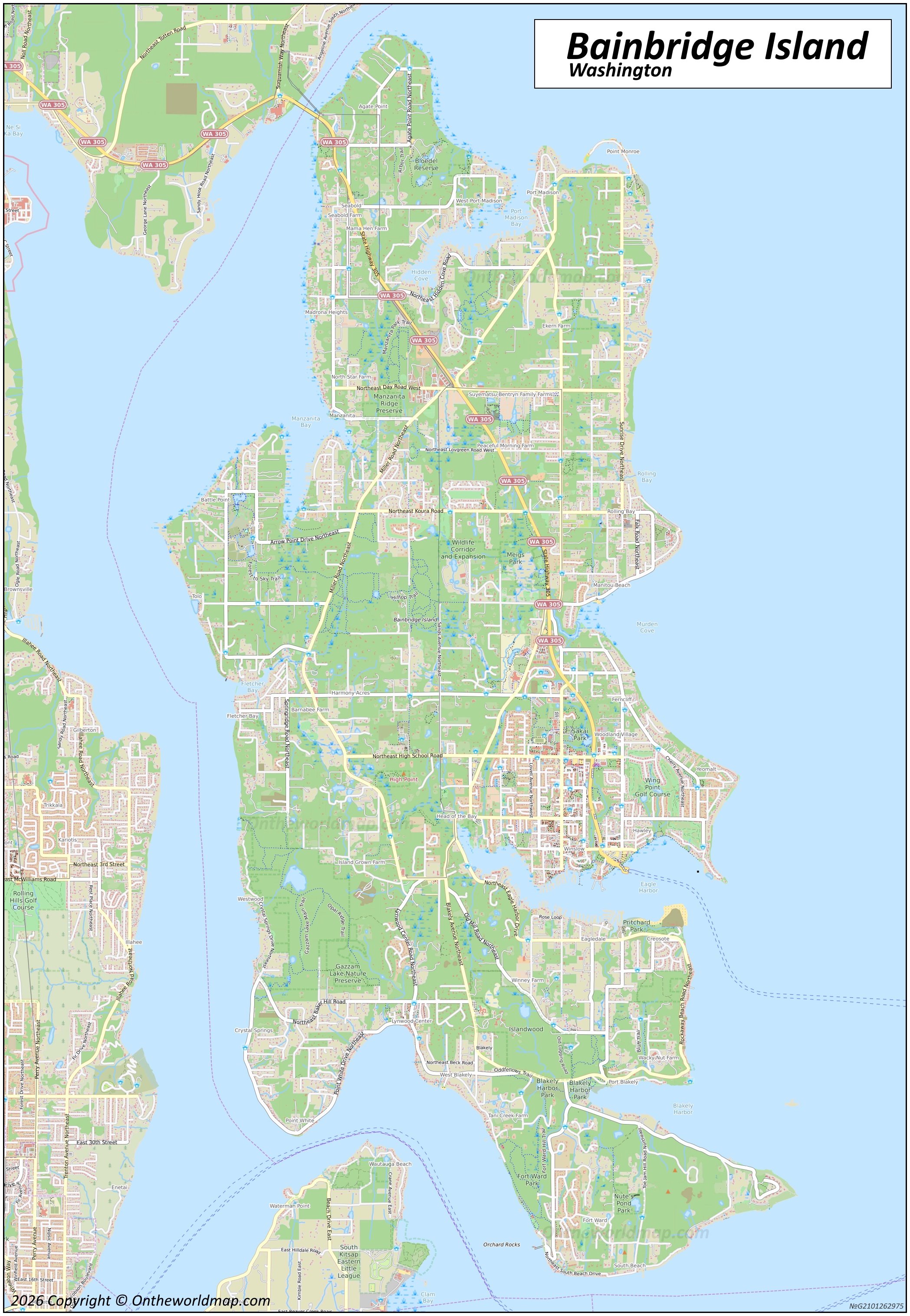 This map shows neighborhoods, villages, streets, roads, beaches, golf courses, lakes, rivers, buildings, trails, and parks on Bainbridge Island.