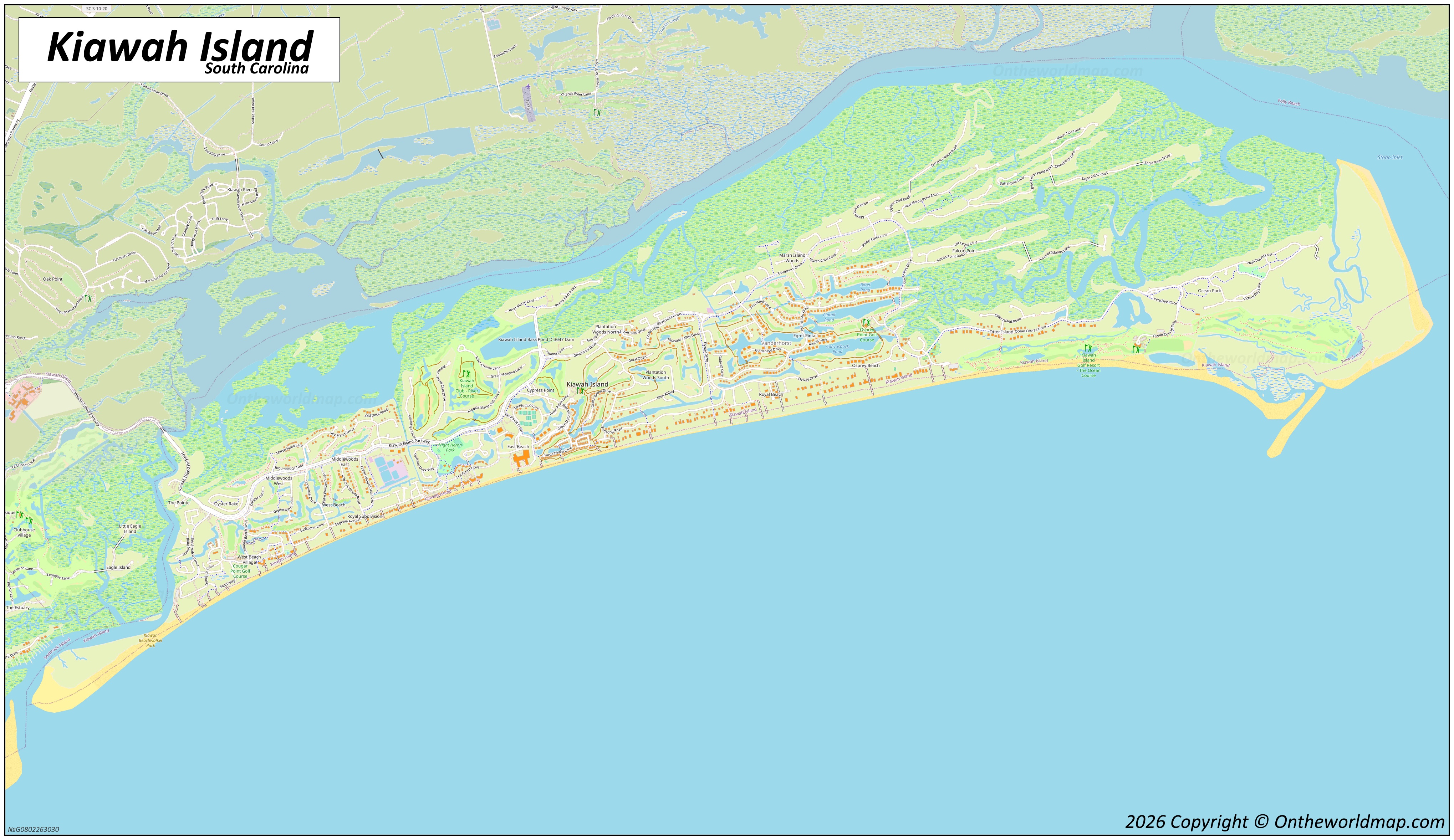 This map shows streets, roads, beaches, rivers, lakes, buildings, golf courses, and trails on Kiawah Island.