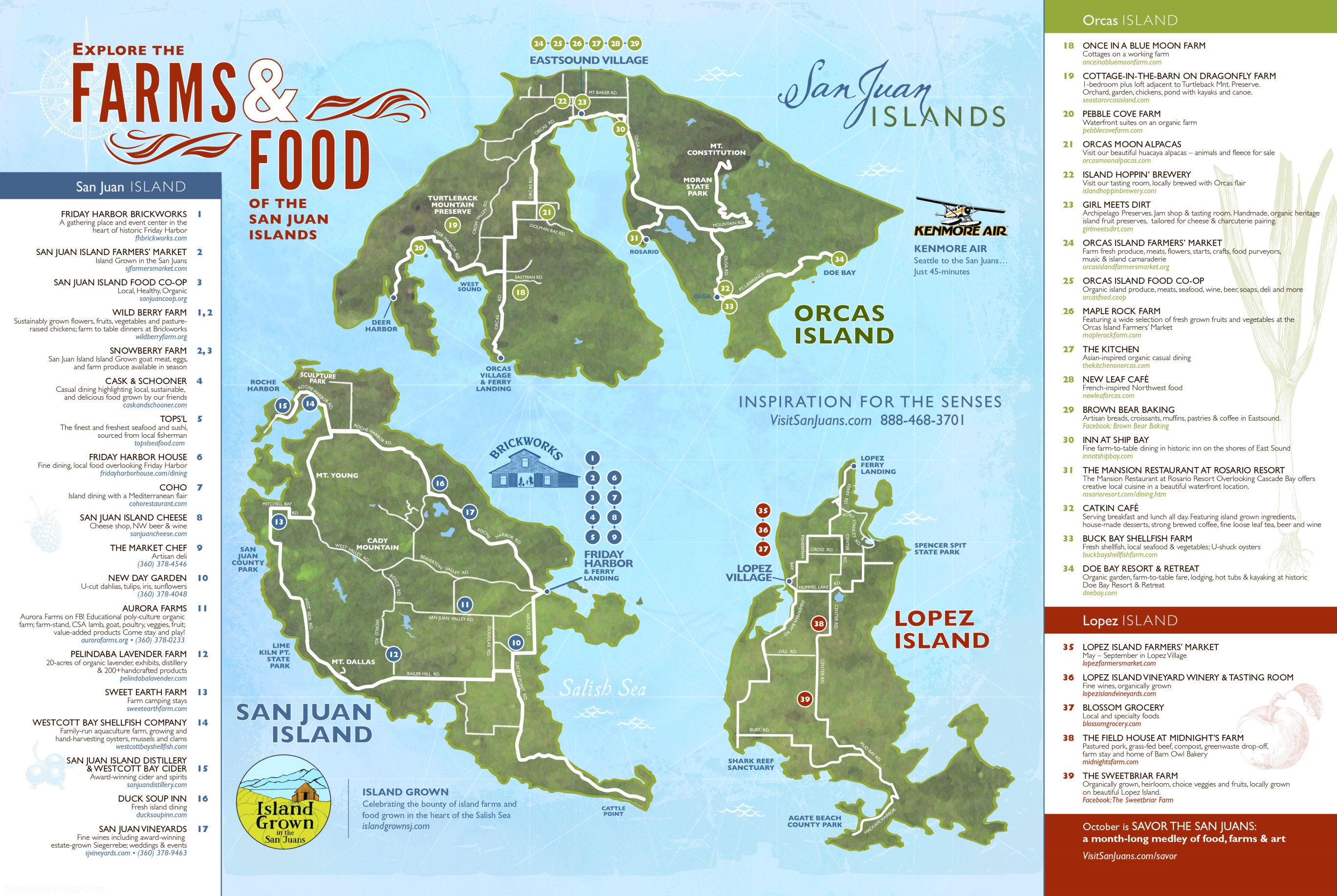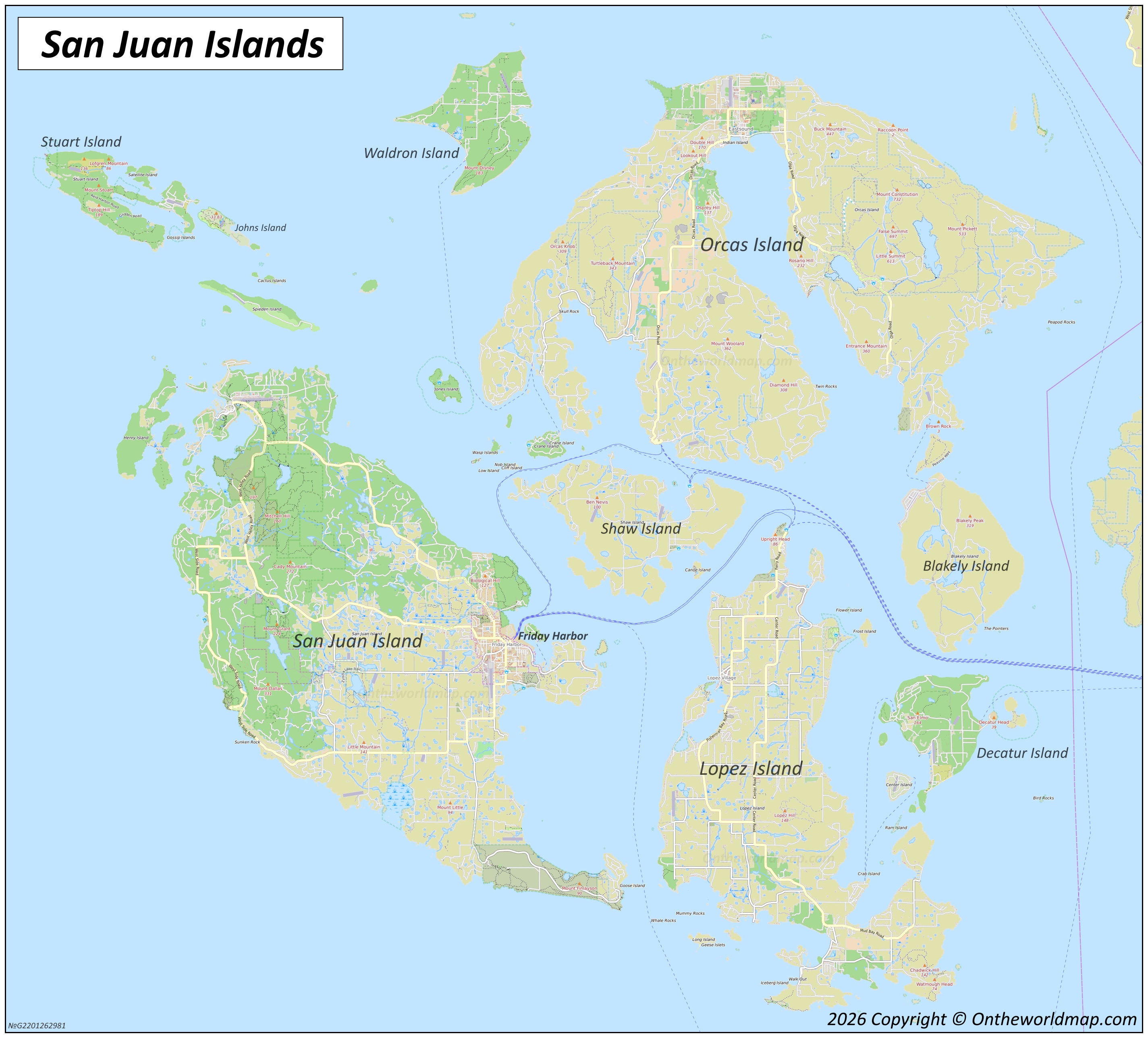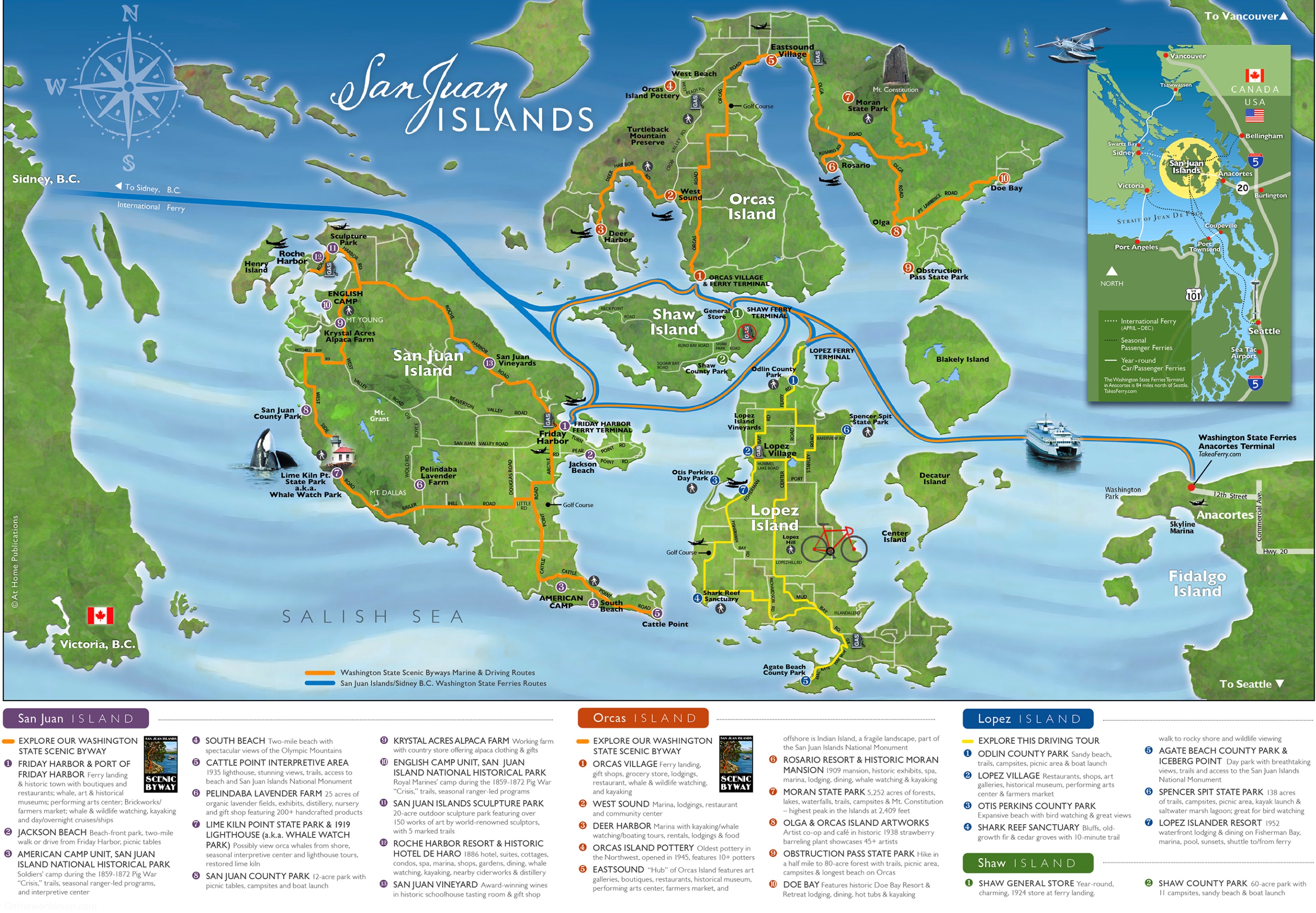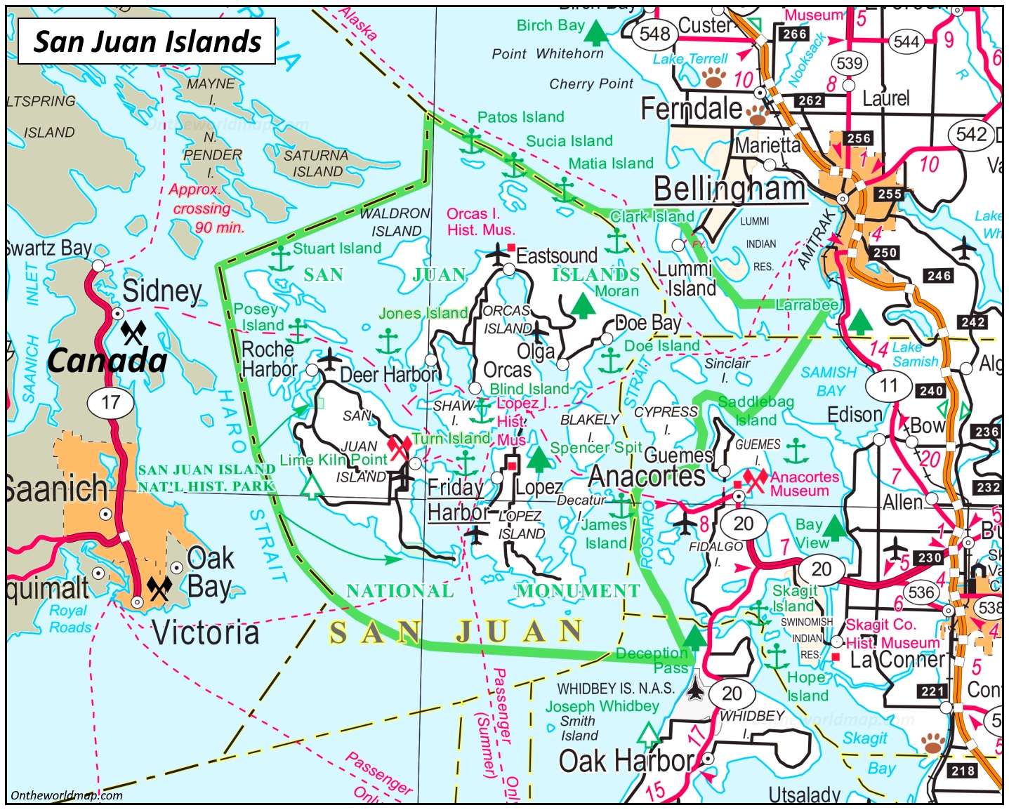 This map shows islands, roads, ferries, airports, and parks on San Juan Islands.