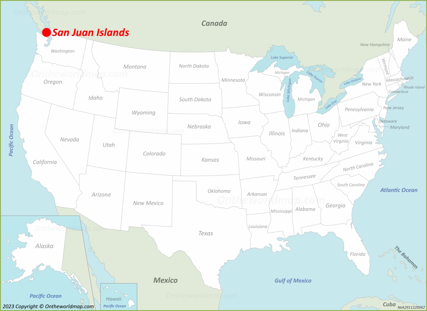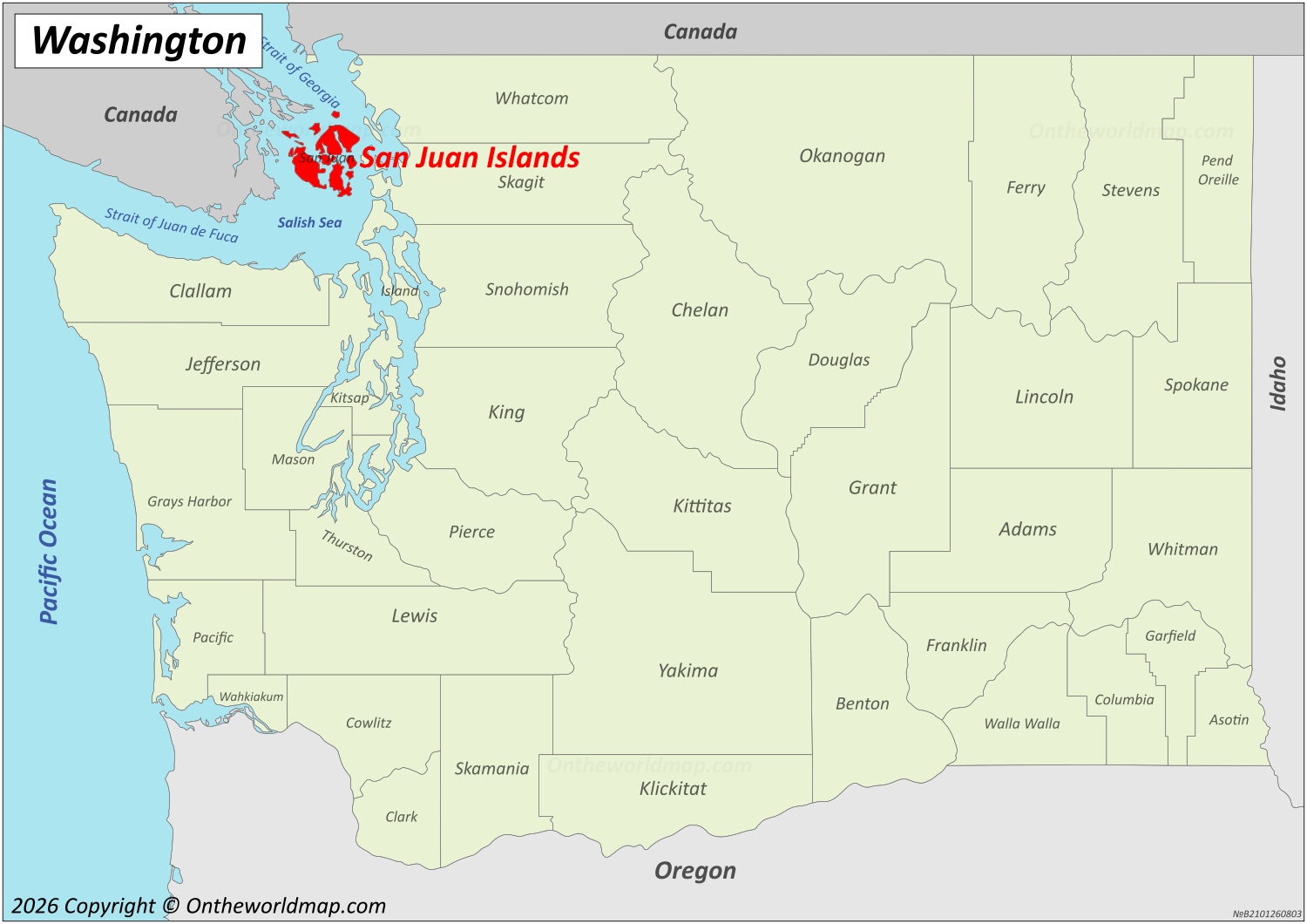 The San Juan Islands are an archipelago located in the northwestern corner of Washington State in the Salish Sea, between the U.S. mainland and Vancouver Island, British Columbia. The archipelago consists of over 400 islands and rocks, with only about 128 named islands, of which the four largest—San Juan Island, Orcas Island, Lopez Island, and Shaw Island—are accessible by the Washington State Ferries system.