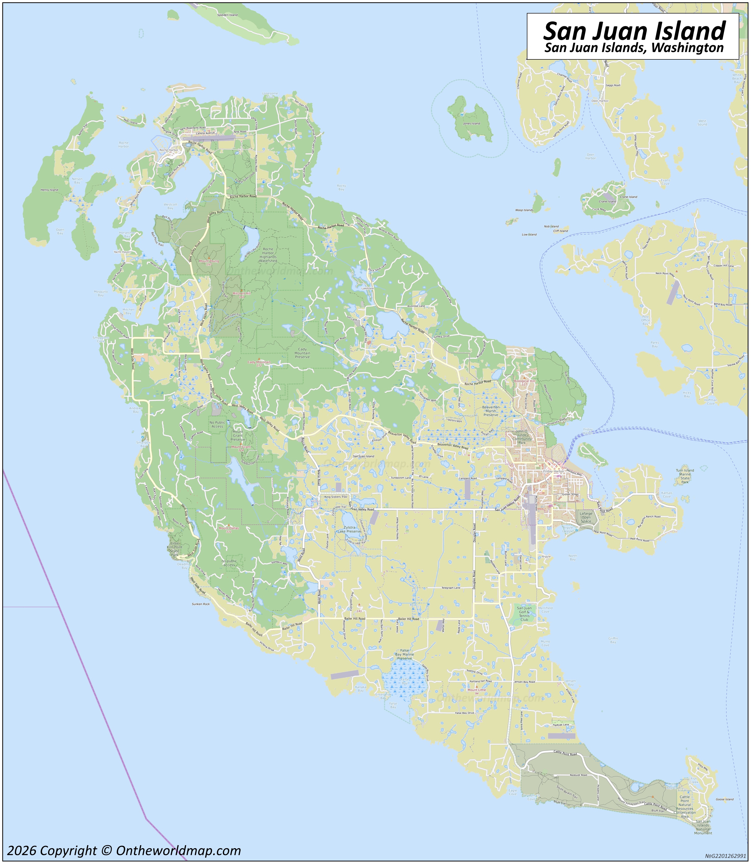 San Juan Island is the second-largest island in the San Juan Islands archipelago, located in the northwestern part of Washington State. The island covers approximately 55 square miles (142 km²) and serves as the cultural and commercial hub of San Juan County. It is home to the county seat, Friday Harbor, which is the largest town in the archipelago and the primary arrival point for visitors traveling by ferry from Anacortes or Sidney, British Columbia.