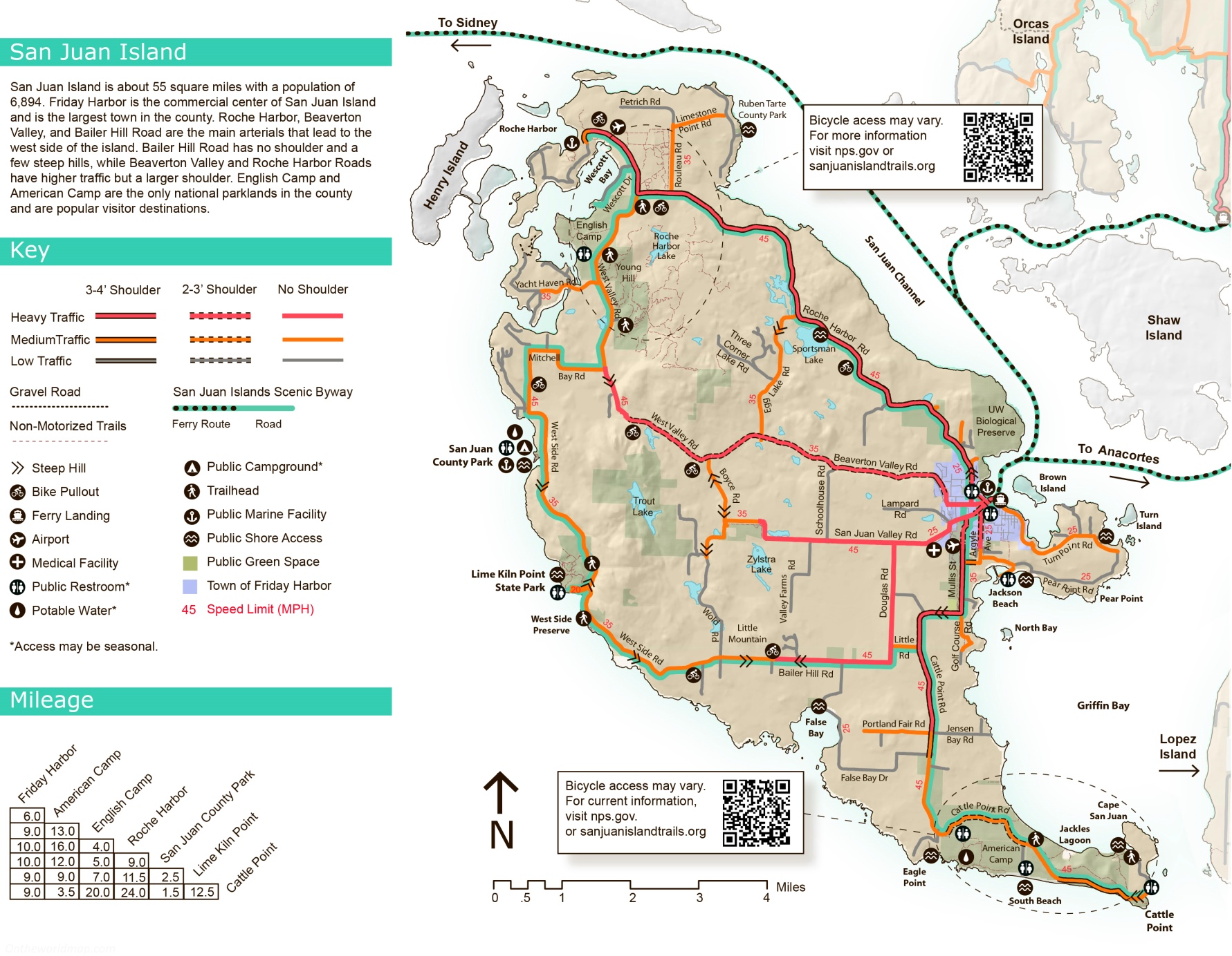 This map shows roads, airport, bike routes, bike pullout, medical facilities, ferry landing, restrooms, public green space, campgrounds, trailheads, trails, and marinas on San Juan Island.