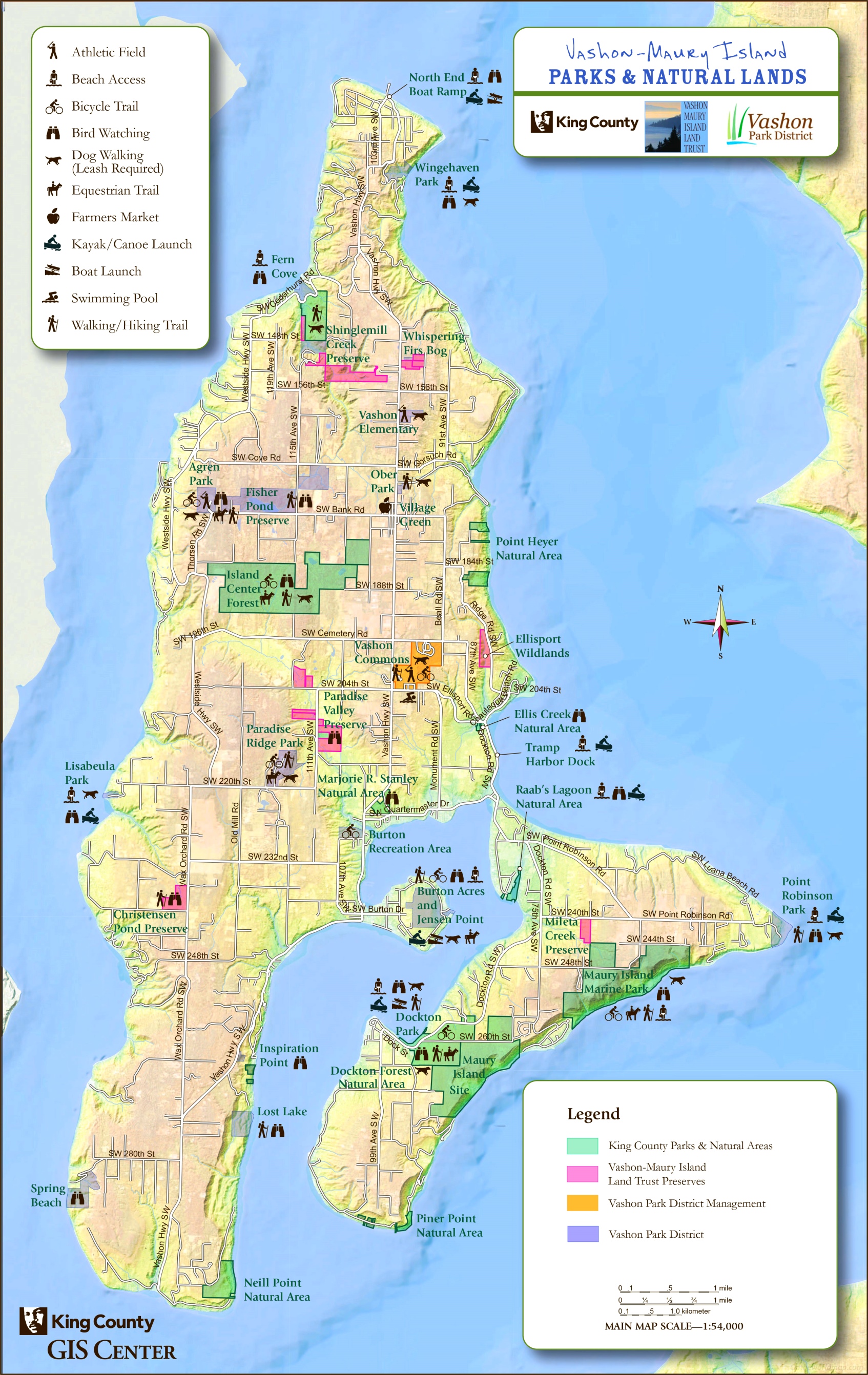 This map shows roads, rivers, athletic fields, beaches, bike trails, bird watching, dog walking, equestrian trails, farmers markets, kayak/canoe launch, boat launch, swimming pools, walking/hiking trails, and parks on Vashon Island.