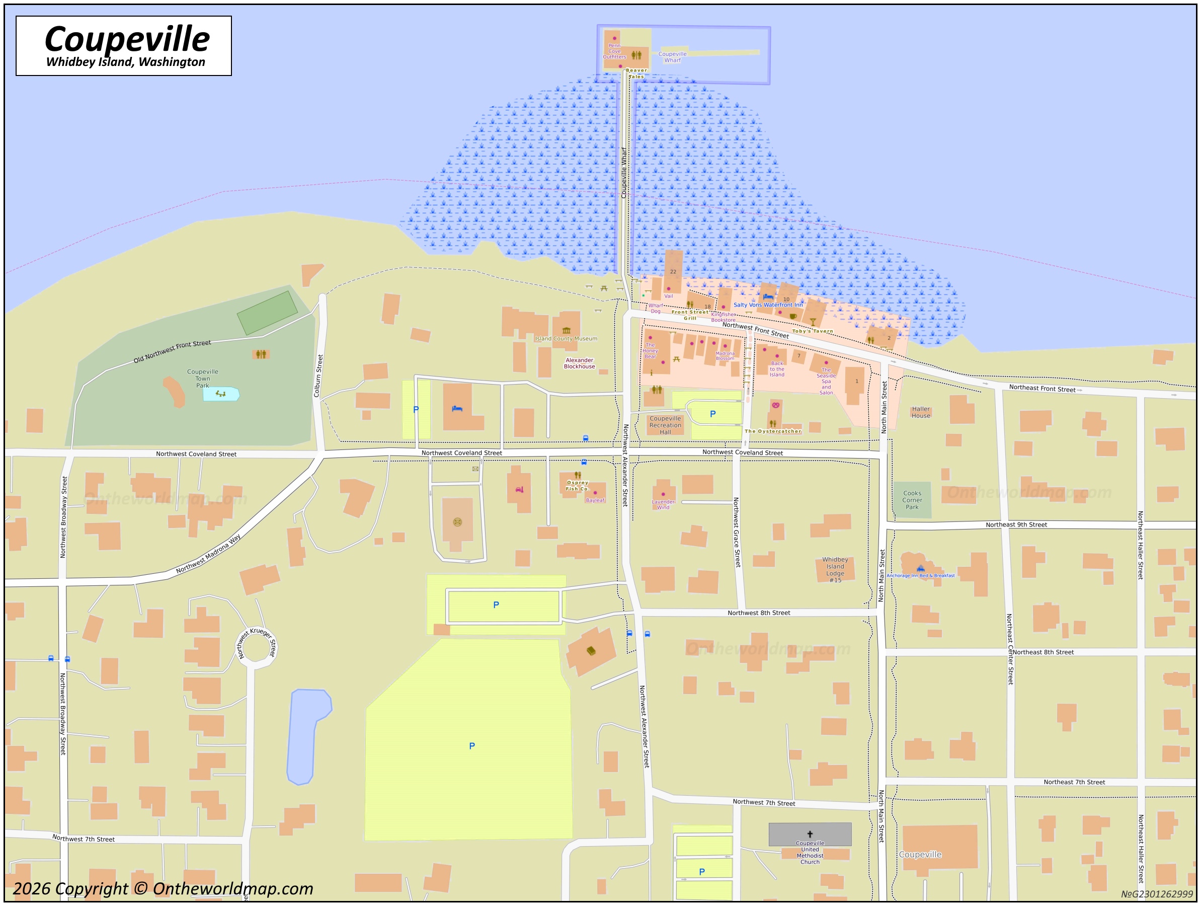 This map shows streets, roads, beaches, buildings, hospitals, parking lots, shops, trails, and parks in Coupeville.