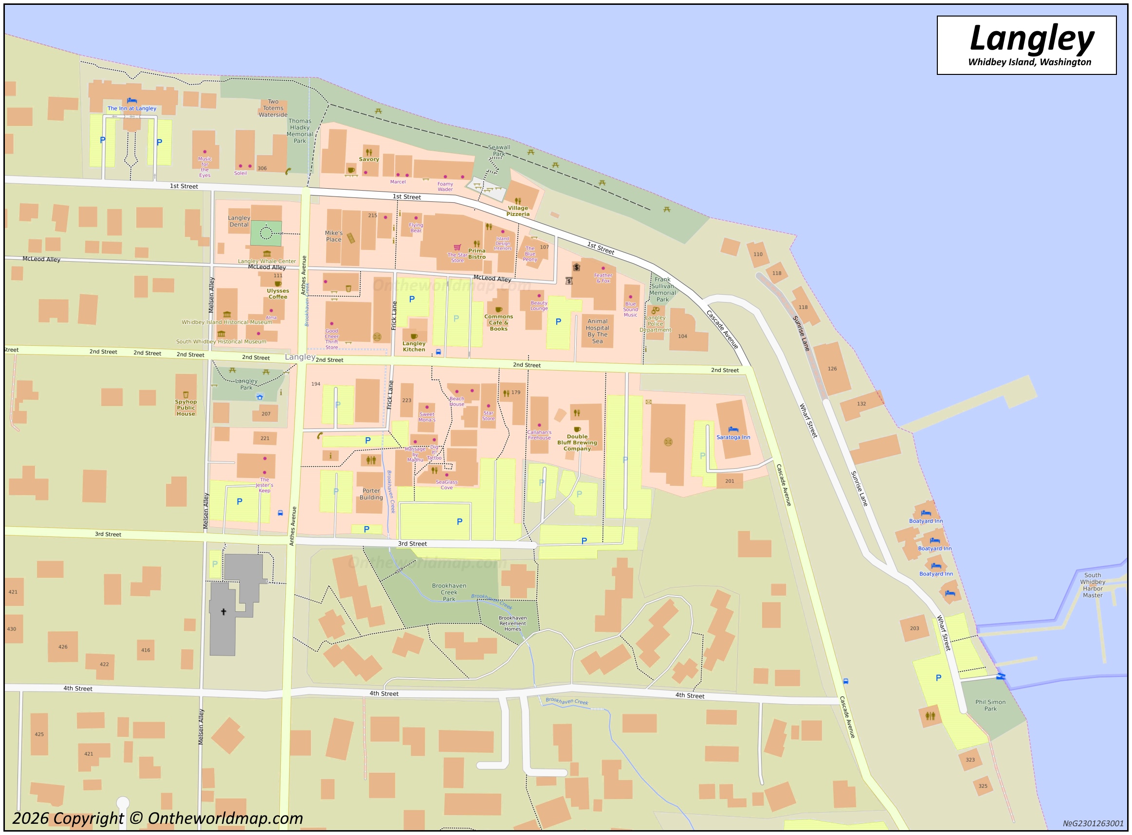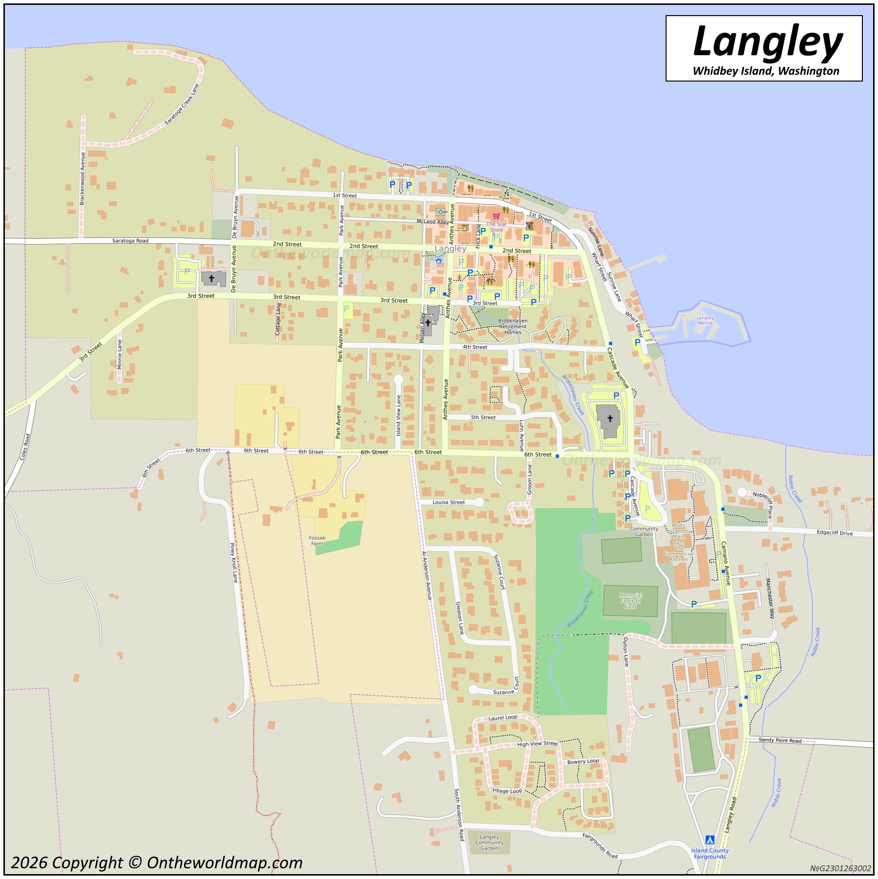 Langley is perched on a bluff approximately 200 feet above Saratoga Passage, providing dramatic views of the water and mountains beyond. The town's commercial core is compact, centered on First and Second Streets, which run parallel to the bluff. Cascade Avenue is the main street leading into town from State Route 525. The Langley Marina and a small beach park are located at the base of the bluff, accessible by a stairway and road.