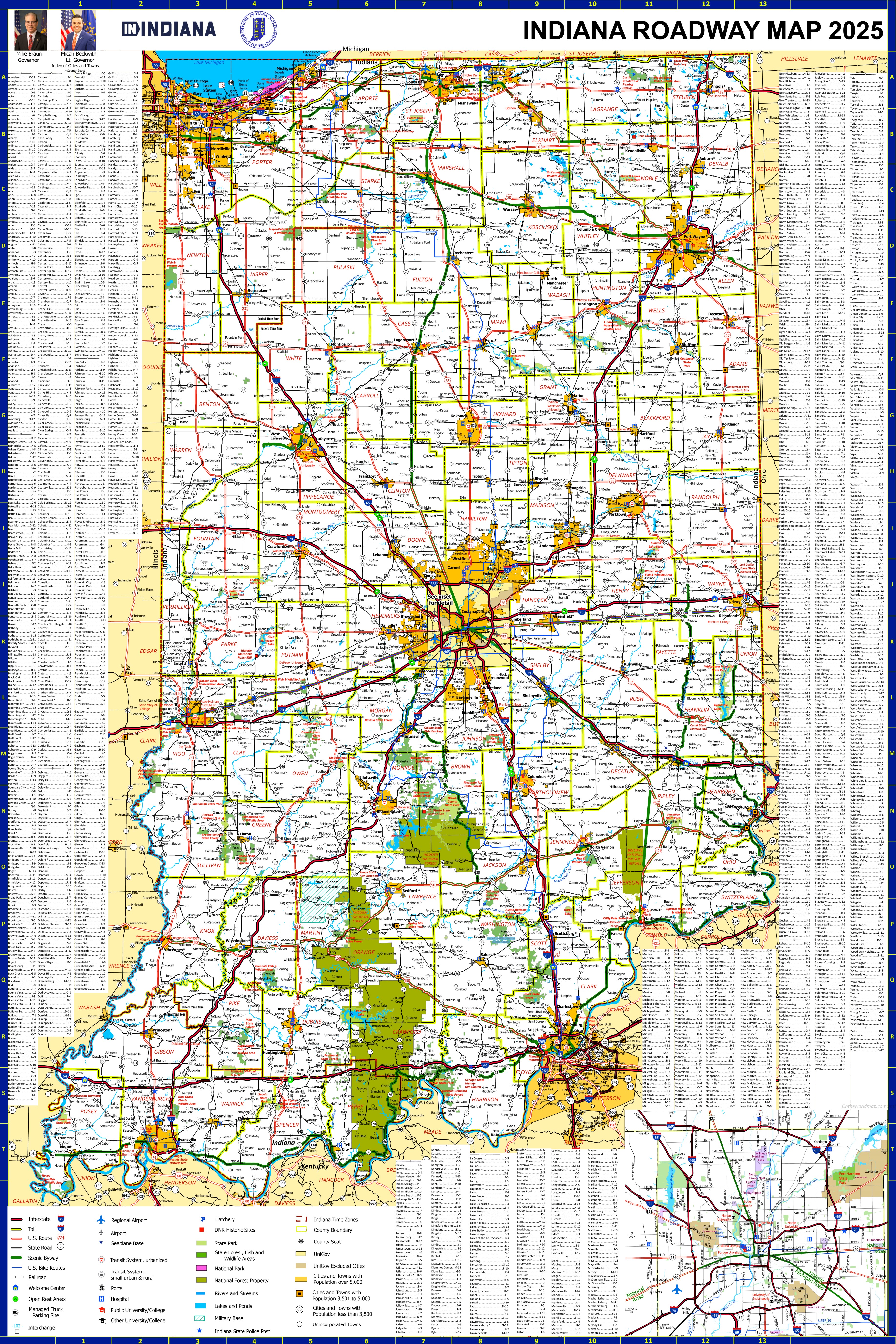 This map shows interstates highways, toll roads, U.S. routes, state roads, scenic byways, U.S. bike routes, railroads, welcome centers, open rest areas, managed truck parking sites, interchange, regional airports, airports, seaplane bases, transit system, hospitals, public university/colleges, other university/colleges, hatchery, DNR historic sites, state parks, state forests, fish and wildlife areas, national park, national forest property, rivers and streams, lakes and ponds, military bases, indiana state police posts, indiana time zones, county boundaries, county seats, UniGov, UniGov excluded cities, cities and towns with population over 5,000, cities and towns with population 3,501 to 5,000, cities and towns with population less than 3,500, and unincorporated towns in Indiana.