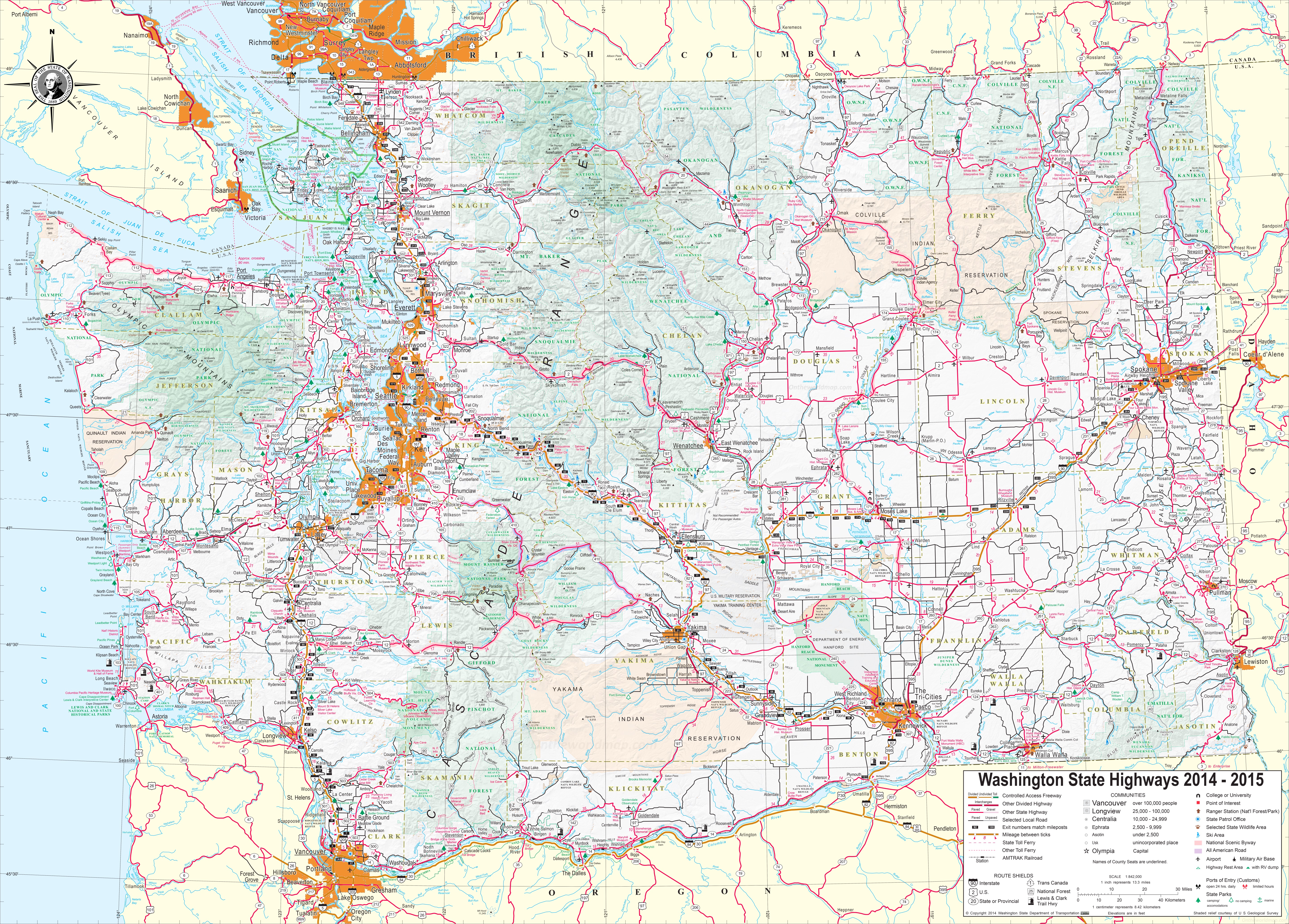 This map shows cities, towns, counties, railroads, interstate highways, U.S. highways, state highways, main roads, secondary roads, rivers, lakes, airports, national parks, state parks, scenic byways, colleges, universities, ranger stations, ski areas, rest areas, and points of interest in Washington.
